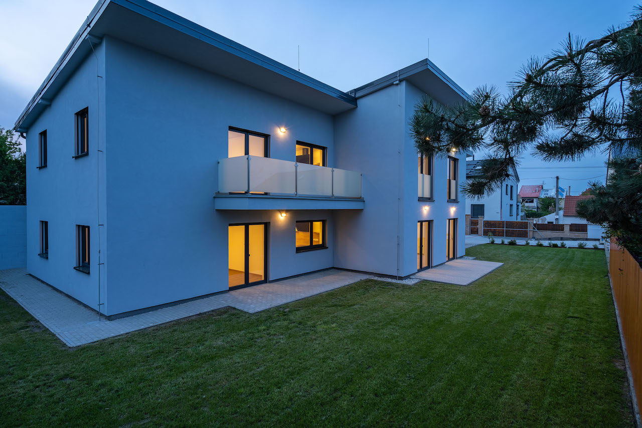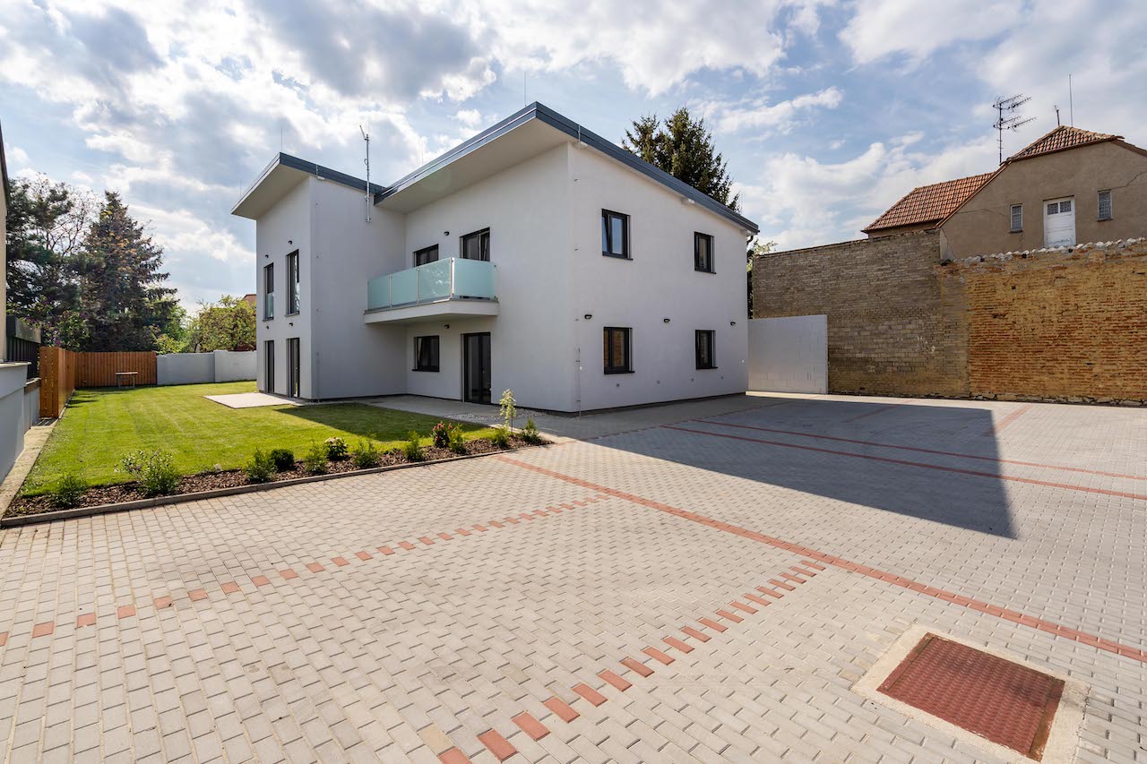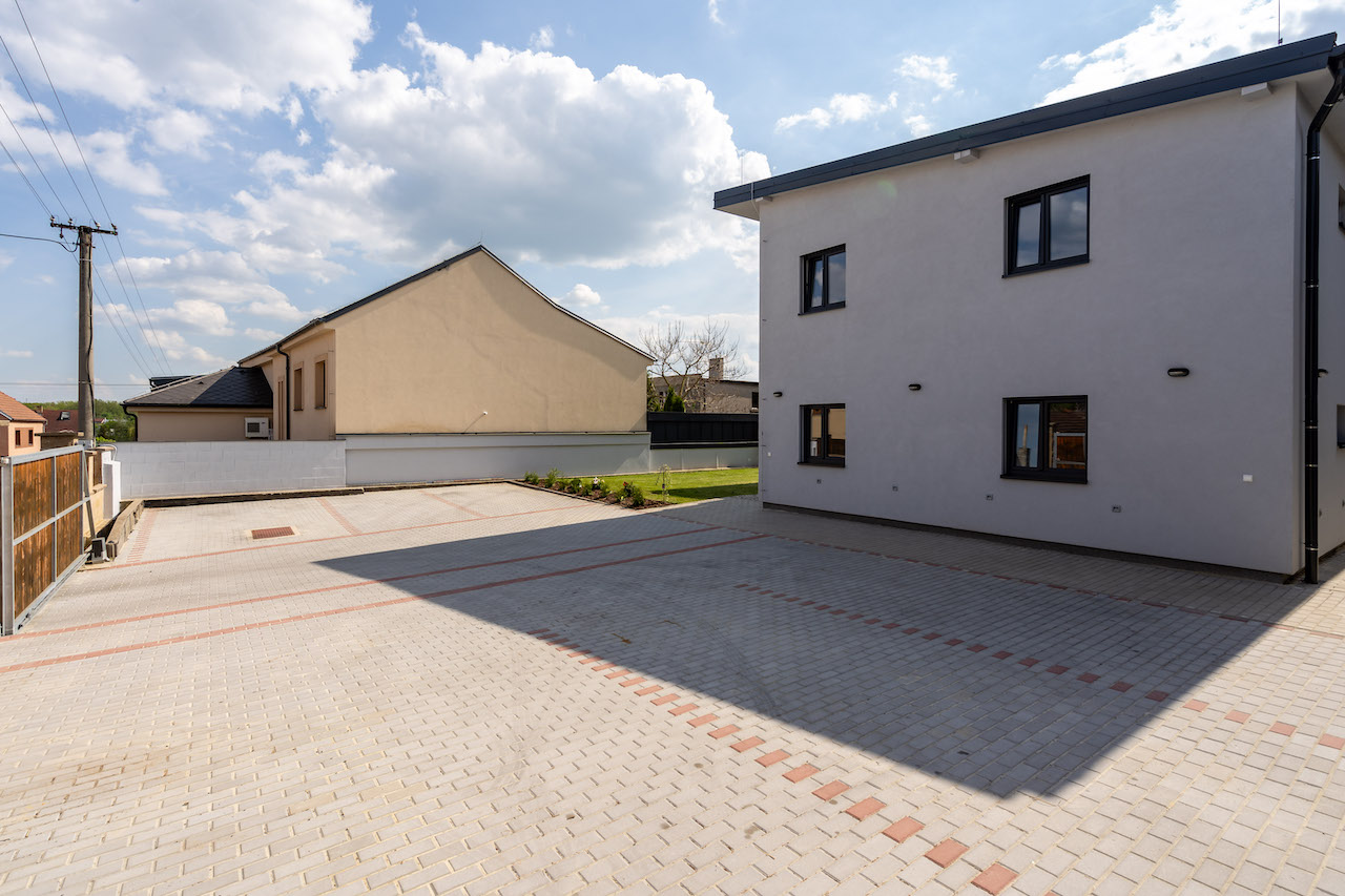 Stavba je osazena do severozápadního rohu pozemku. Dům je zastřešen pultovou střechou s falcovaným plechem Lindab. Okolí domu je převážně zatravněné a na jihovýchodní straně – za příjezdovou branou je šest parkovacích míst. Stavba je založena na základových betonových pasech. Zdivo je z pórobetonových tvárnic Ytong se zateplovacím systémem z EPS tl. 120mm. Plastová okna i dveře mají trojskla a dálkově ovládané venkovní rolety. Vytápění je v celém domě řešeno elektrickým podlahovým topením. Ohřev užitkové vody pak v jednotlivých částech zajišťují elektrické bojlery. Dům je napojen na obecní vodovod, elektřinu 230 i 400V i kanalizaci a k dispozici je také kopaná studna. Ložnice mají přípravu na klimatizační jednotky.
