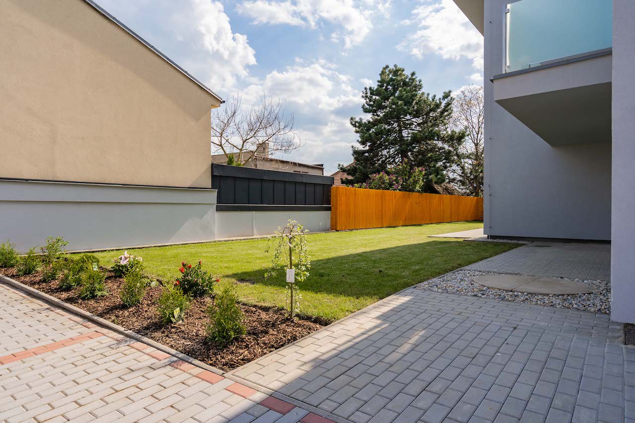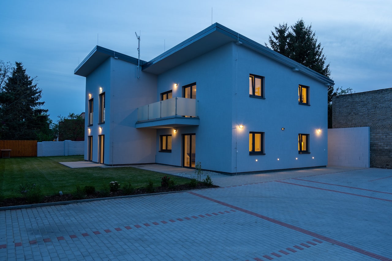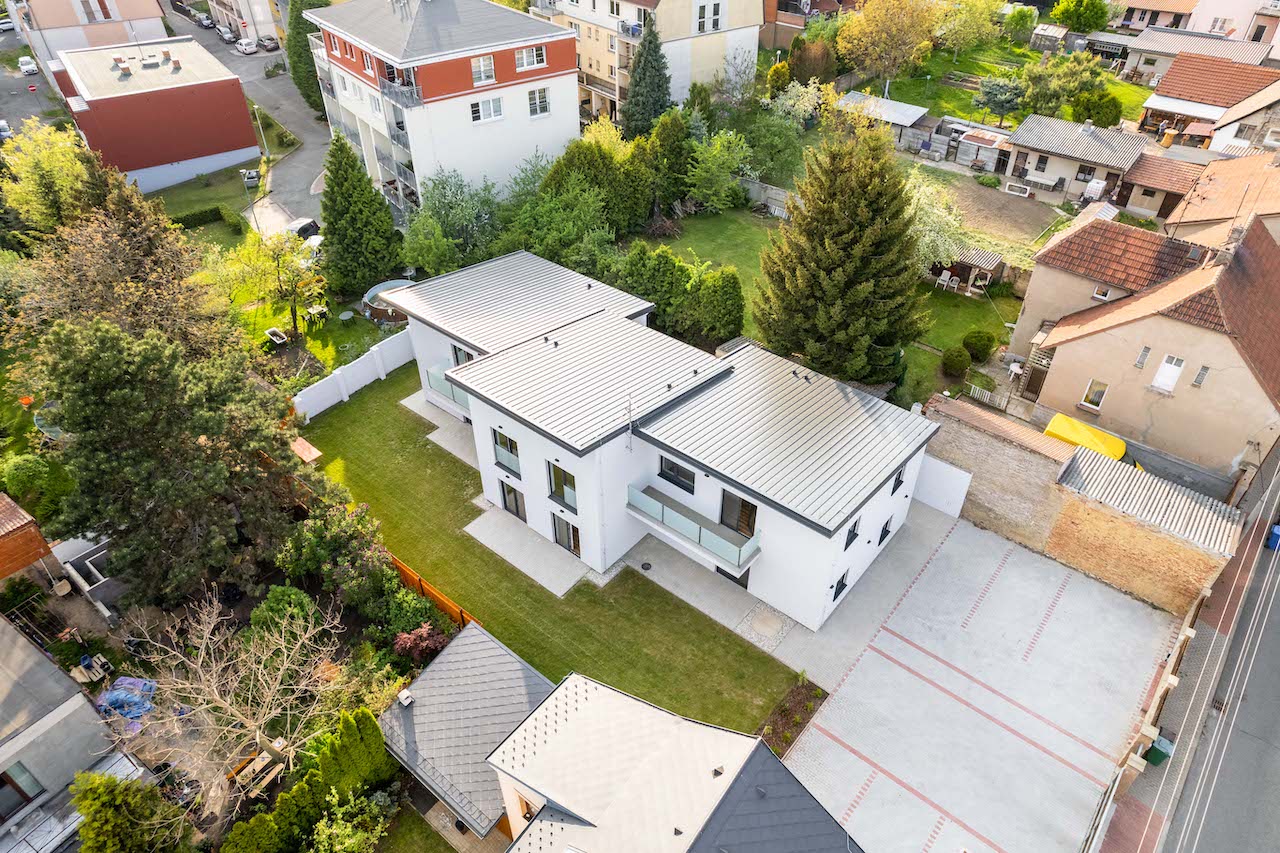 Stavba je osazena do severozápadního rohu pozemku. Dům je zastřešen pultovou střechou s falcovaným plechem Lindab. Okolí domu je převážně zatravněné a na jihovýchodní straně – za příjezdovou branou je šest parkovacích míst. Stavba je založena na základových betonových pasech. Zdivo je z pórobetonových tvárnic Ytong se zateplovacím systémem z EPS tl. 120mm. Plastová okna i dveře mají trojskla a dálkově ovládané venkovní rolety. Vytápění je v celém domě řešeno elektrickým podlahovým topením. Ohřev užitkové vody pak v jednotlivých částech zajišťují elektrické bojlery. Dům je napojen na obecní vodovod, elektřinu 230 i 400V i kanalizaci a k dispozici je také kopaná studna. Ložnice mají přípravu na klimatizační jednotky.