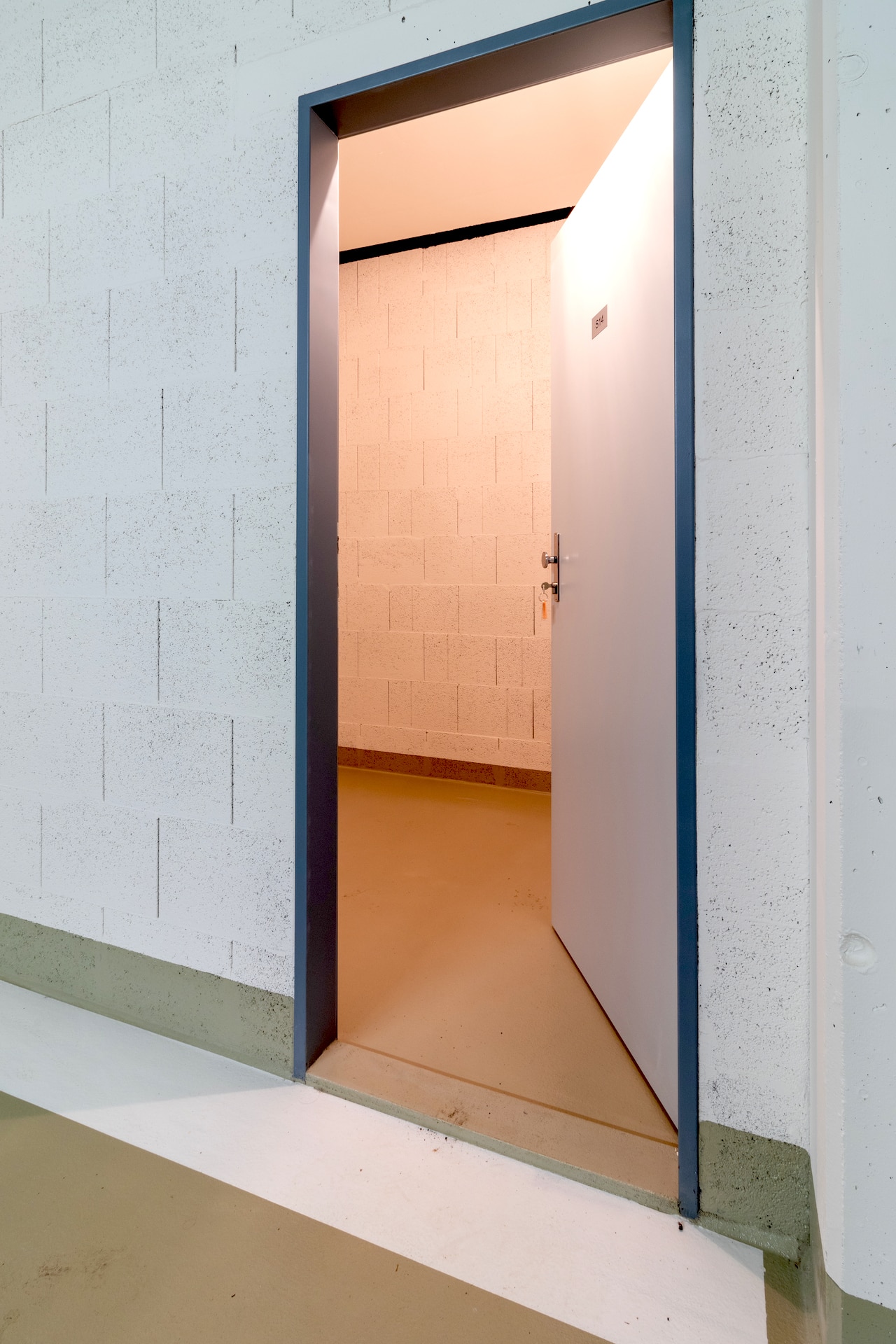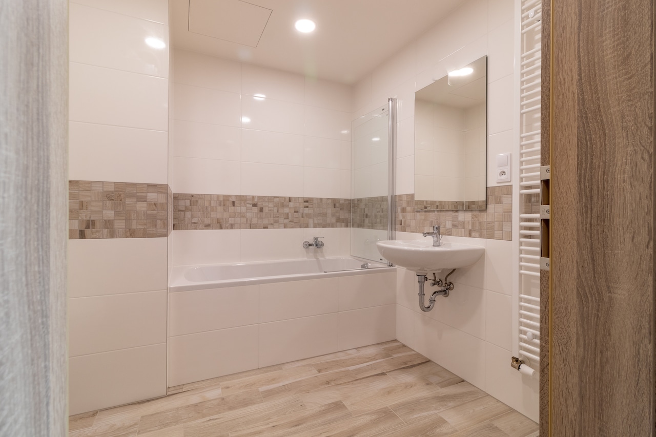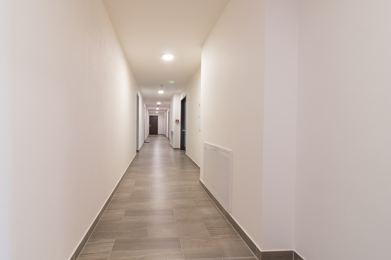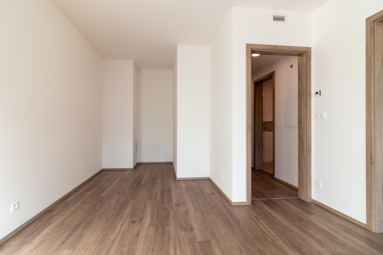 Byt sestává ze zádveří s vestavěnými skříněmi, obývacího pokoje s na míru vybavenou kuchyňskou linkou (lednice, trouba, varná deska, mikrovlnná trouba, myčka), ložnice a koupelna – zde je jako u jednoho z mála bytů vana se sprchovací skleněnou stěnou.