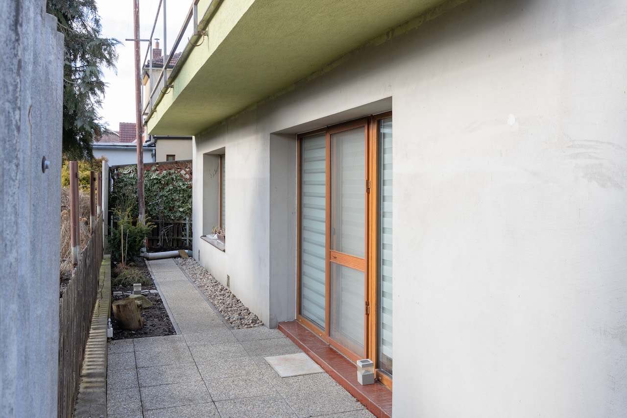 Rodinný dům má dispozici 5+1, dvě koupelny, halu, dvě WC, šatnu, garáž a parkovat se dá i v ulici před domem. V přízemí se nachází zádveří (5m2), hala ze schodištěm (22m2), koupelna se sprchovým koutem (3,5m2) a wc (2m2). Ale hlavně je zde obývací pokoj (20m2) s velkými francouzskými okny a kuchyň (16m2). Z chodby je pak vstup do garáže (25m2) s úložnými prostory.