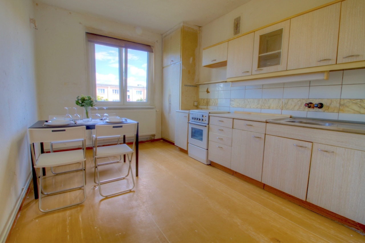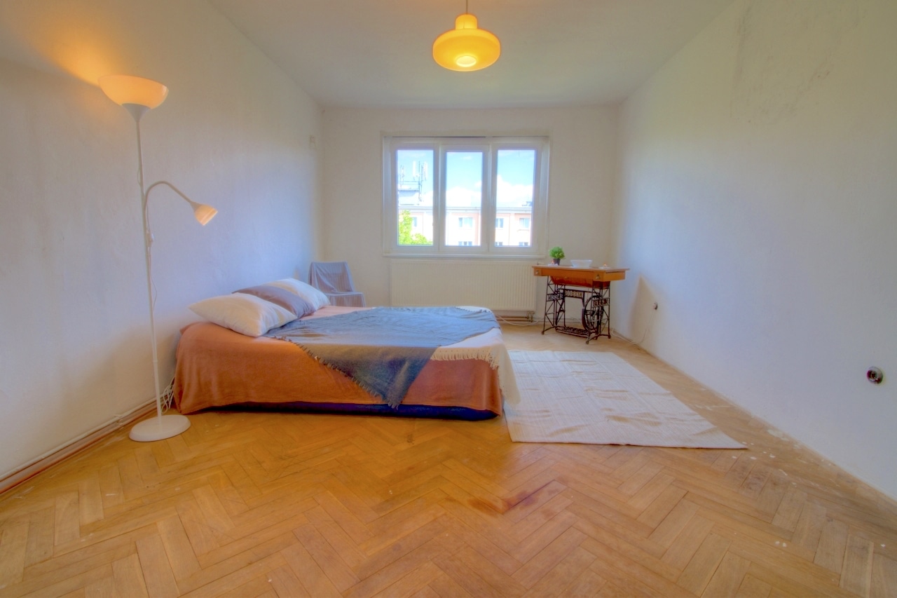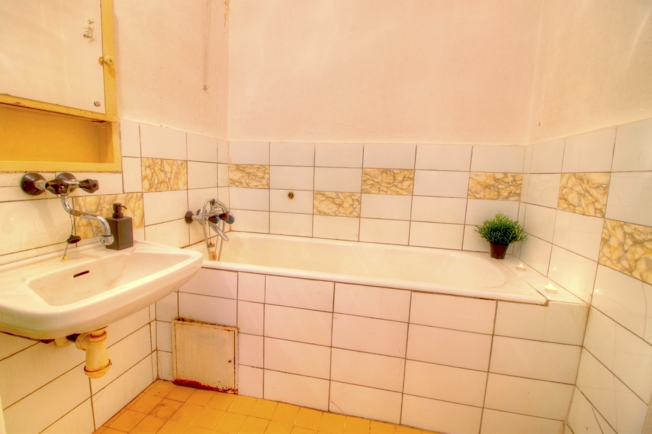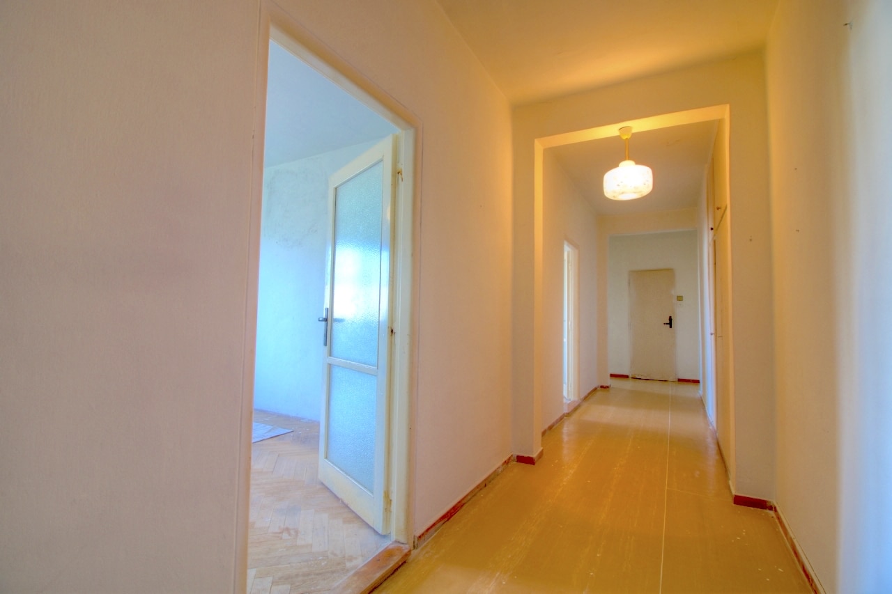 Byt o ploše 67,5 m2 určitě čeká kompletní rekonstrukce, ale díky dispozici, prostorným neprůchozím místnostem s vysokými stropy, které spojuje chodba s úložnými prostory – má tato „dvajednička“ opravdu velký potenciál.