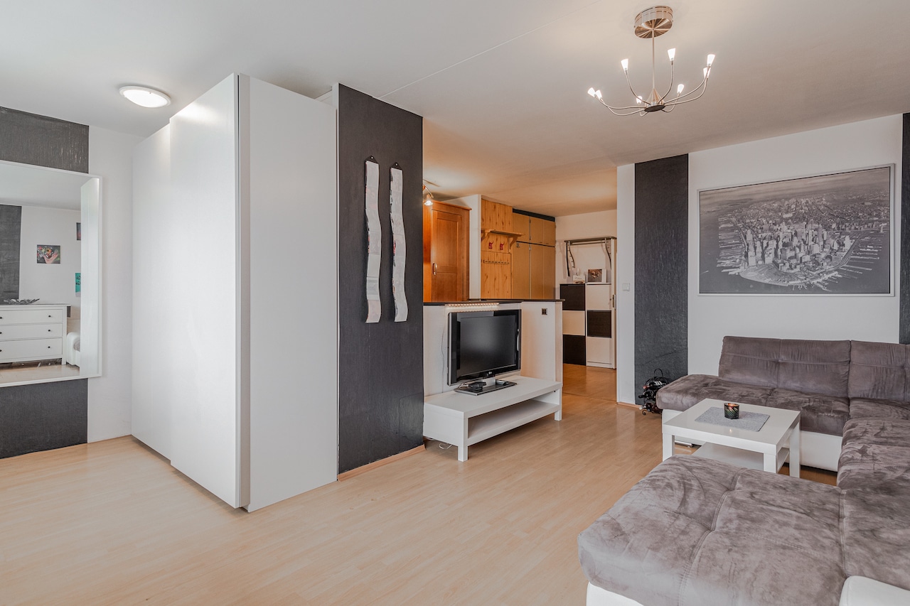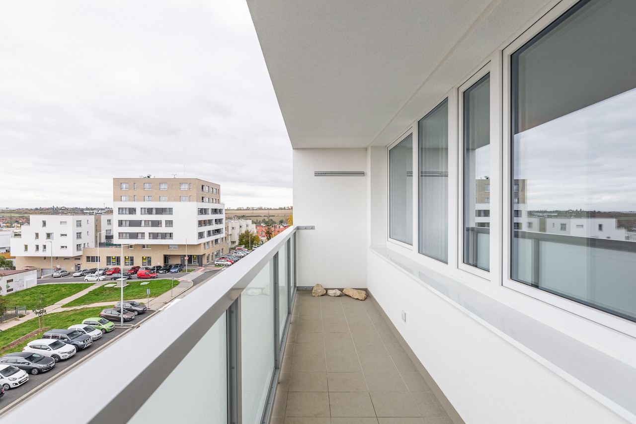 Jedná se o třípokojový byt s moderním kuchyňským koutem, předsíní s úložnými prostory, koupelnou s vanou,  samostatným WC a technickým koutem / skladem, kde je pračka i sušička. Byt má 83m2 užitné plochy včetně 7m2 lodžie, která je orientovaná na východ. Dostatek úložných prostor nabízí vestavěné skříně v předsíni a „pracovním“ koutu. Obývací pokoj s kuchyňským koutem má velká okna orientována na východ, což zajišťuje dostatek světla a příjemnou atmosféru. Naopak ložnice a dětský pokoj jsou orientovány do vnitrobloku západním směrem. Vysoký komfort bydlení zajišťuje samotné provedení a dispozice bytu. Praktické využití kuchyňského koutu s prostorným obývacím pokojem jen doplňuje celkově skvělý dojem. Dispozičně je také možné byt předělat na 4+kk. K bytu náleží také sklepní kóje 4,1m2.