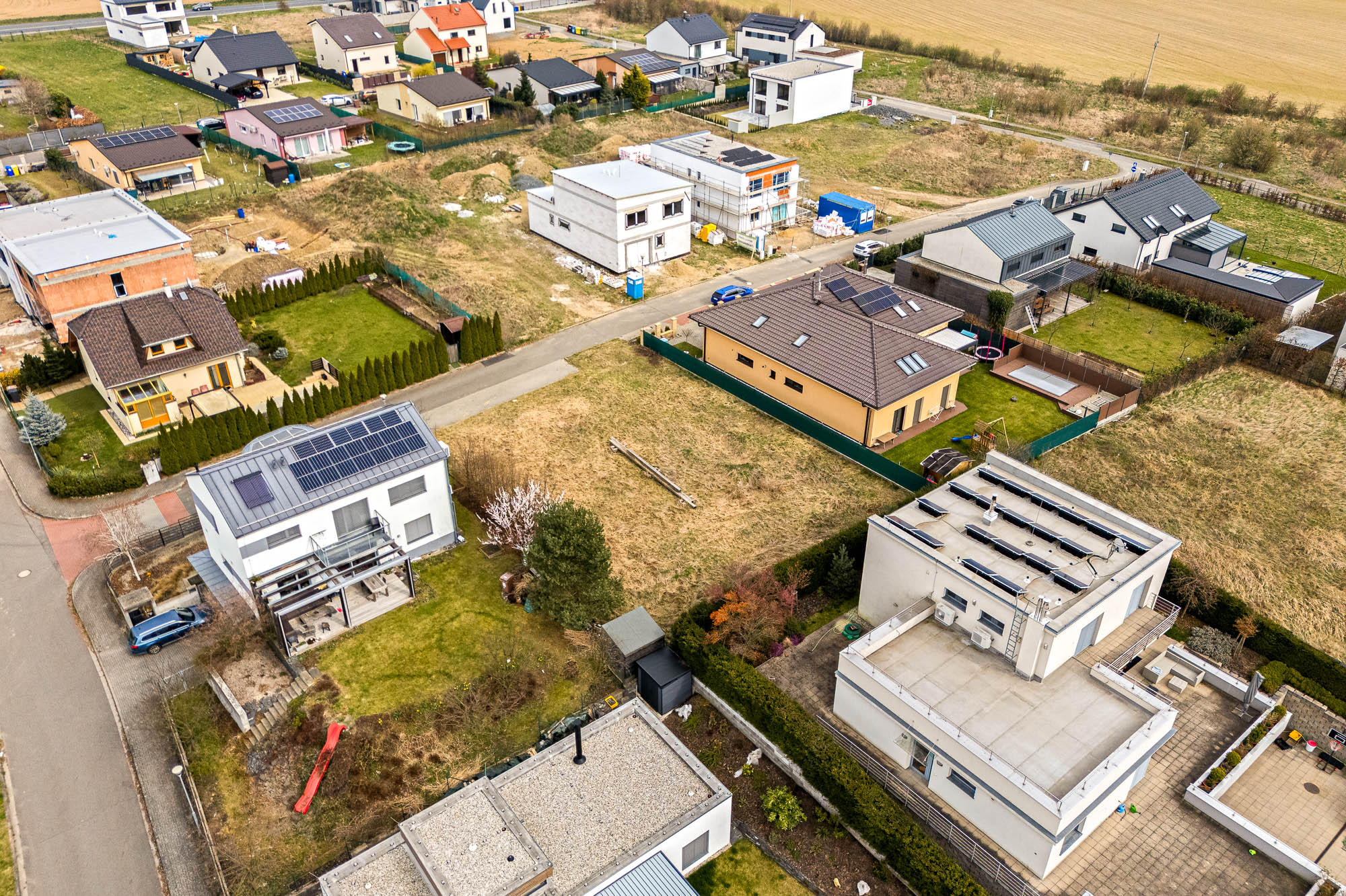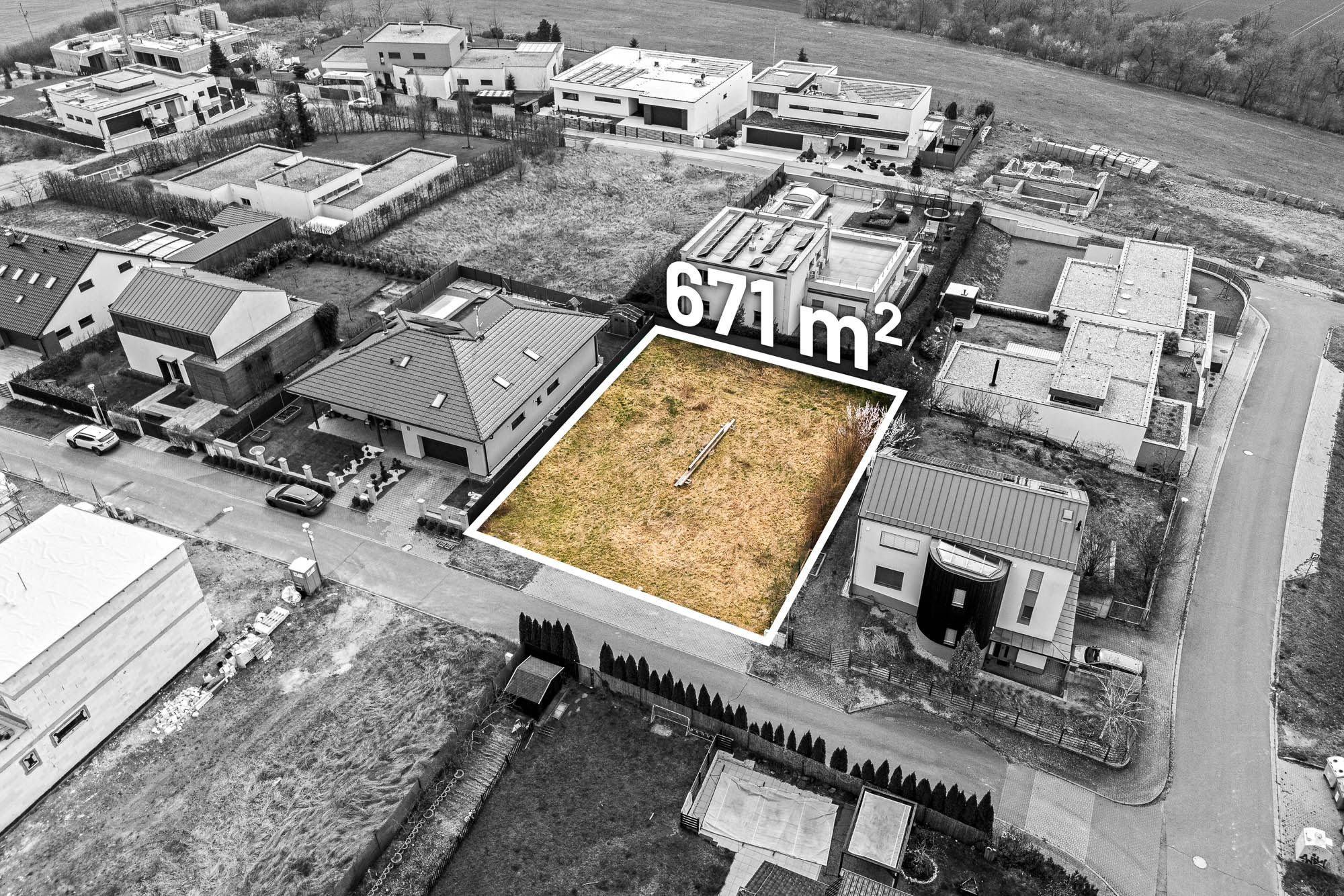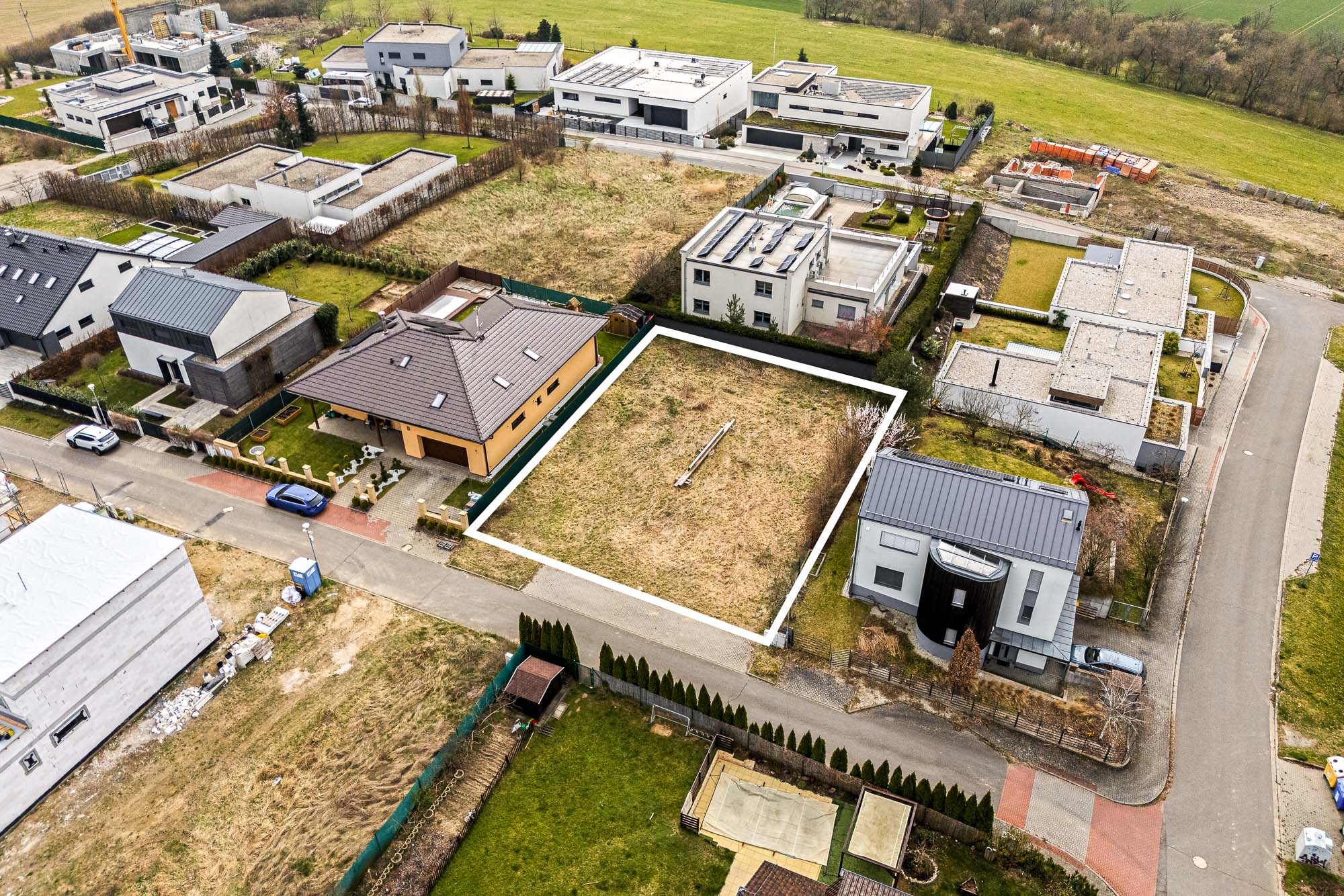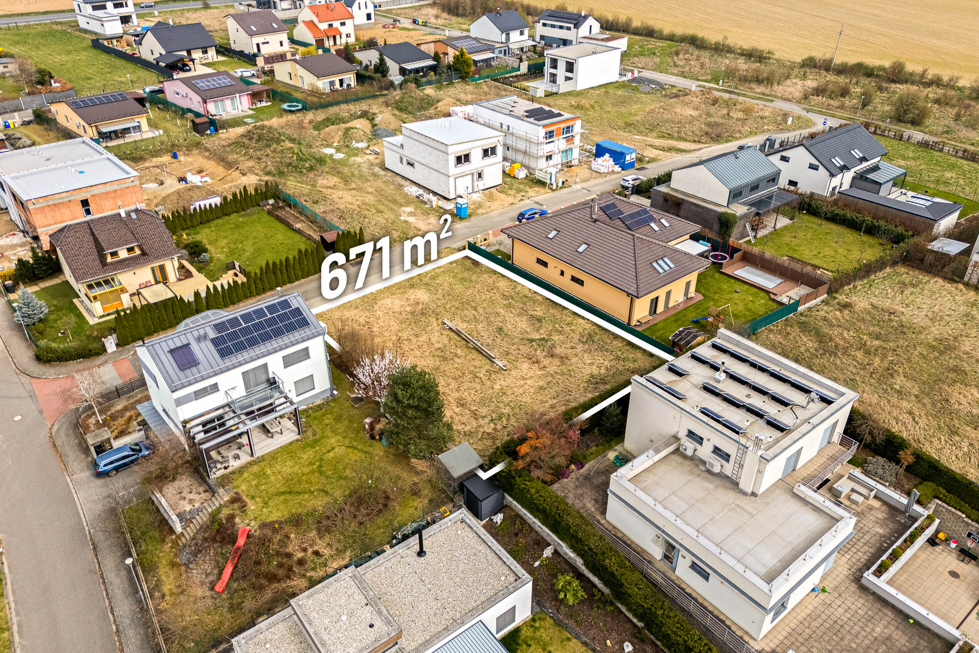 Stavební pozemek o velikosti 671 metrů čtverečních poskytuje dostatek prostoru pro rodinný dům i zahradu. Velkou výhodou je chytře řešená zástavba v okolí. Rodinné domy v sousedství jsou navrženy tak, aby si každá rodina užila maximální soukromí. Jeden z nich má dokonce vjezd do garáže v ulici za rohem.