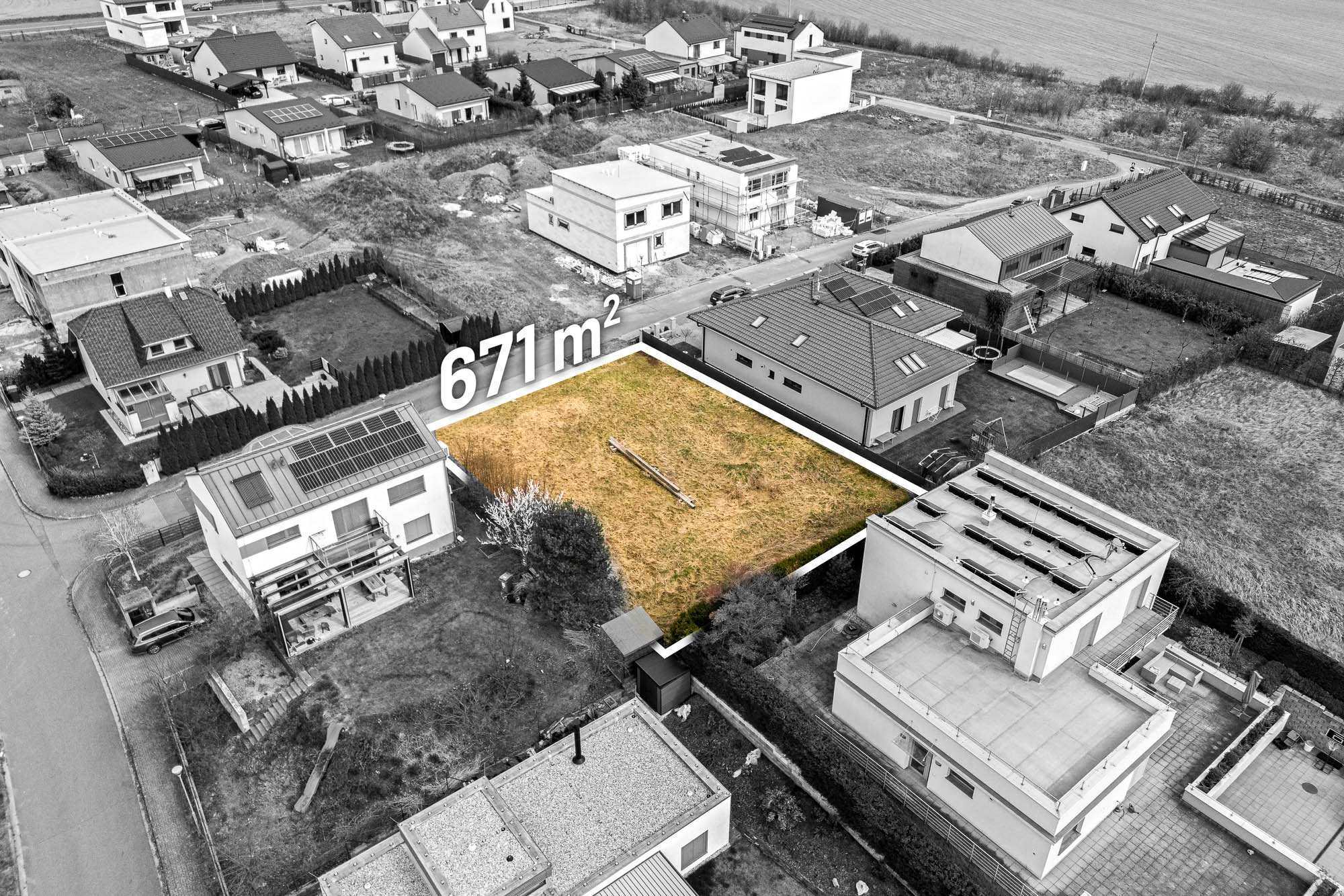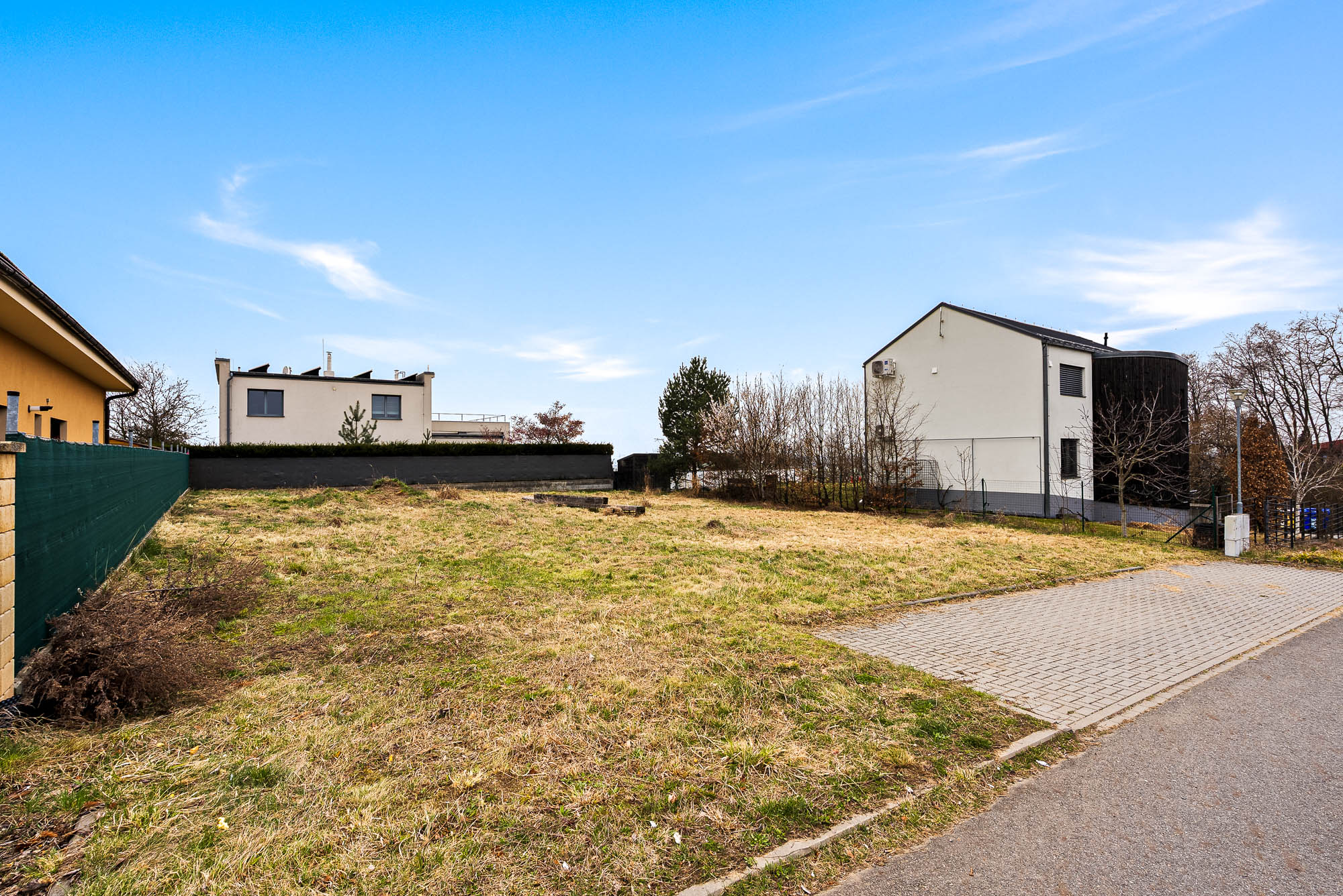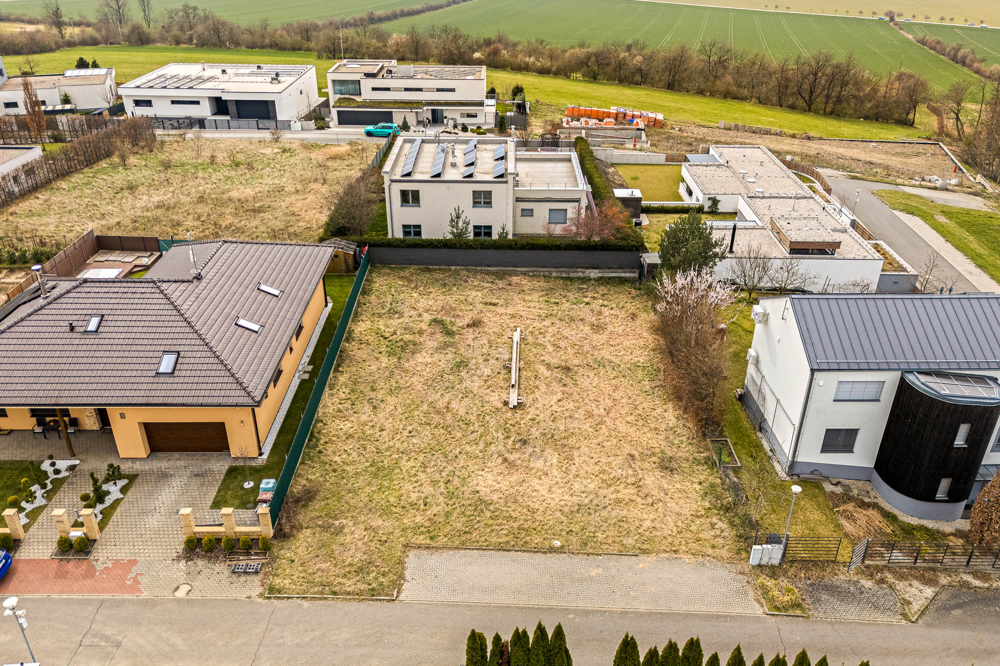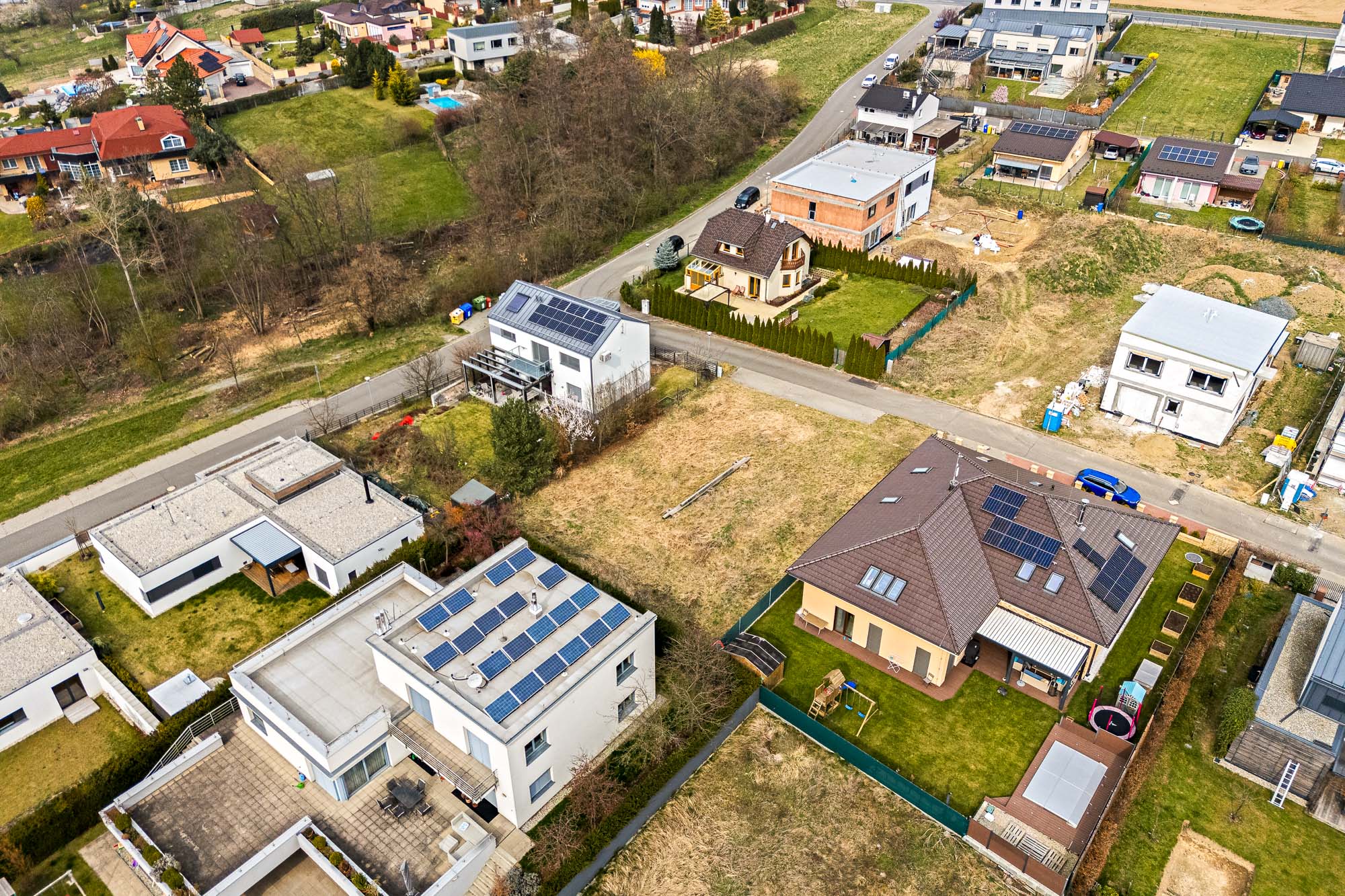Stavební pozemek o velikosti 671 metrů čtverečních poskytuje dostatek prostoru pro rodinný dům i zahradu. Velkou výhodou je chytře řešená zástavba v okolí. Rodinné domy v sousedství jsou navrženy tak, aby si každá rodina užila maximální soukromí. Jeden z nich má dokonce vjezd do garáže v ulici za rohem.