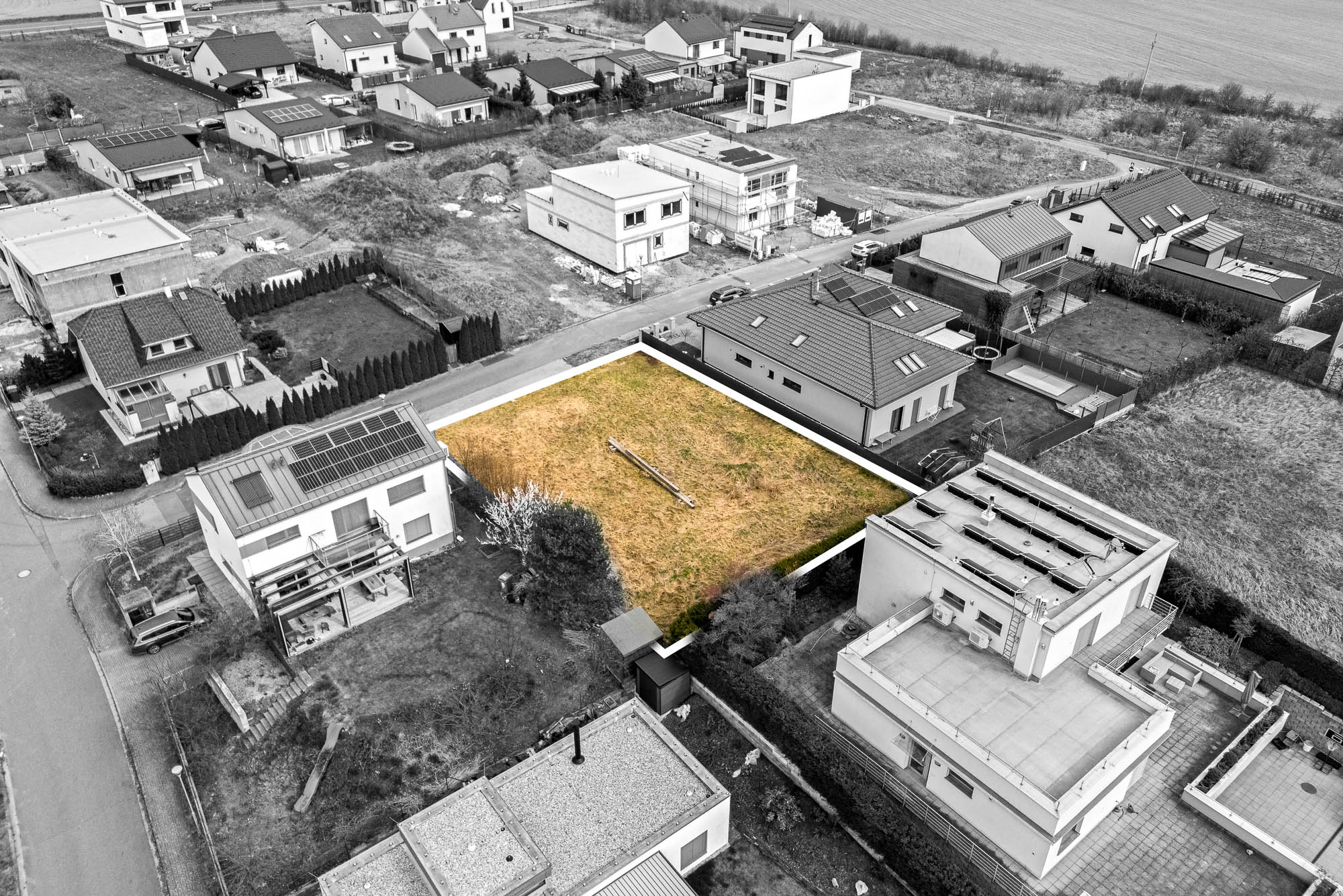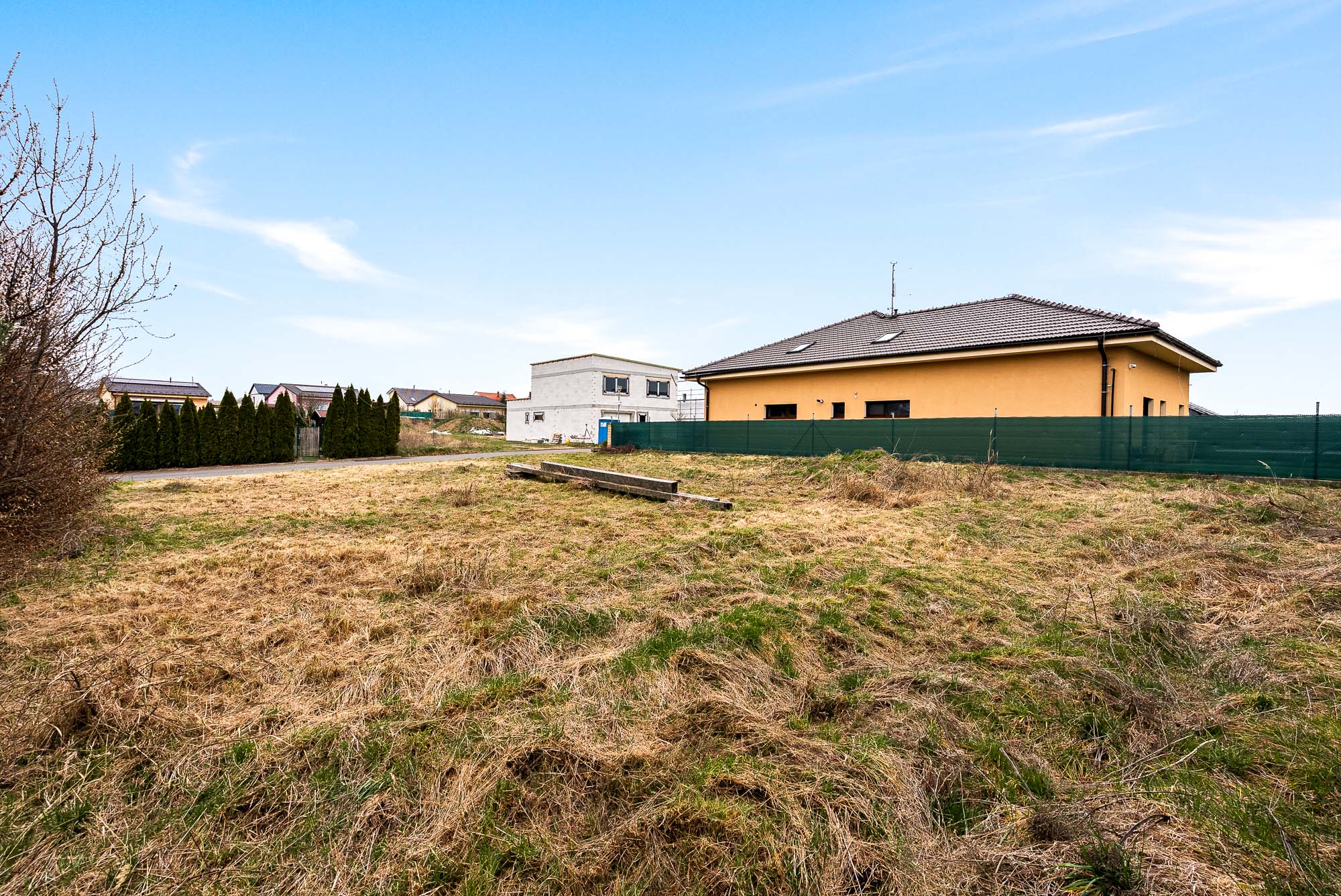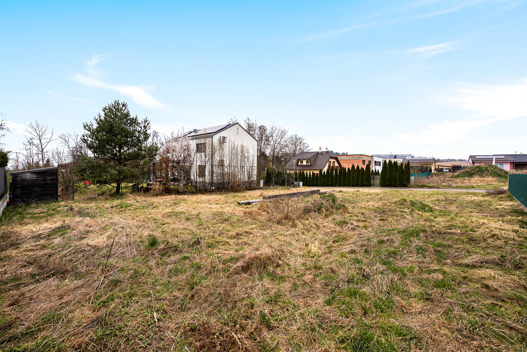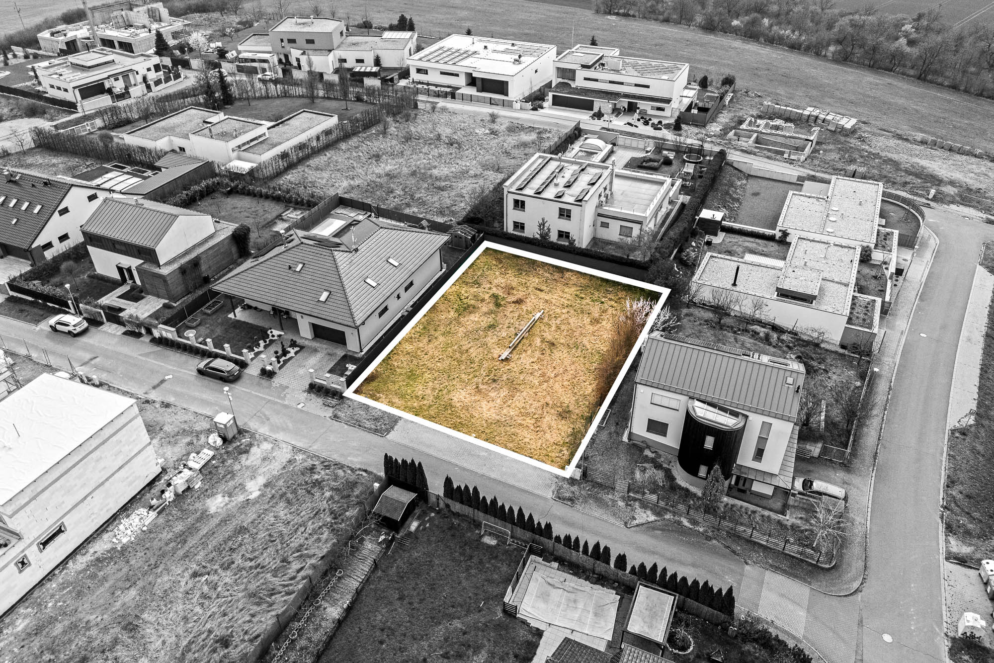 Stavební pozemek o velikosti 671 metrů čtverečních poskytuje dostatek prostoru pro rodinný dům i zahradu. Velkou výhodou je chytře řešená zástavba v okolí. Rodinné domy v sousedství jsou navrženy tak, aby si každá rodina užila maximální soukromí. Jeden z nich má dokonce vjezd do garáže v ulici za rohem.