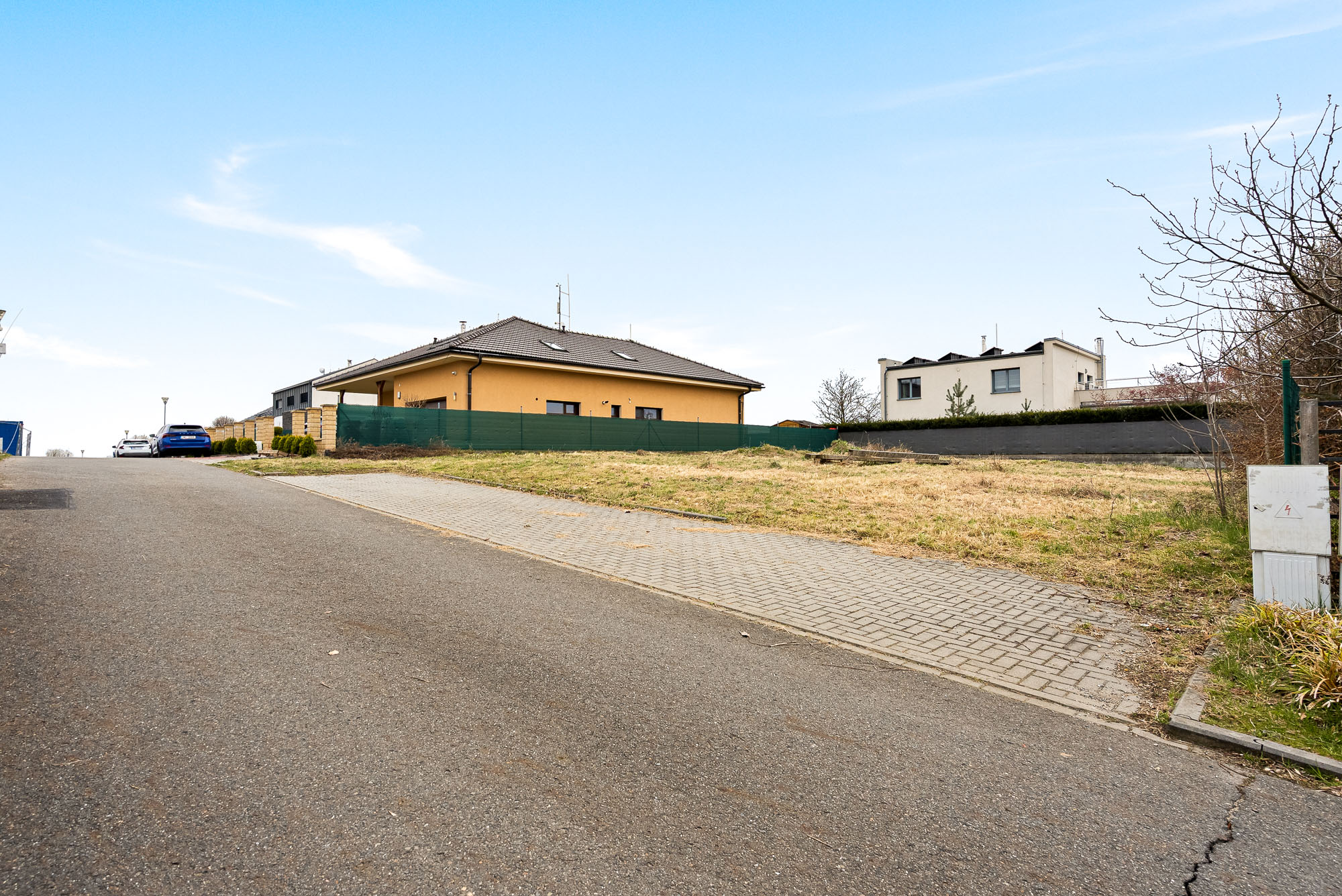 Součástí pozemku je přímý přístup z klidné ulice a praktický parkovací záliv pro dvě osobní auta. Veškeré inženýrské sítě – voda, elektřina, plyn i kanalizace – jsou k dispozici.
