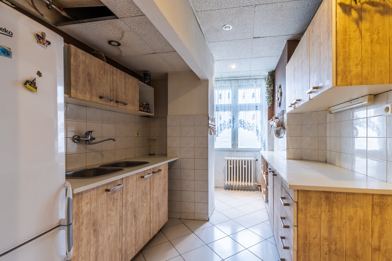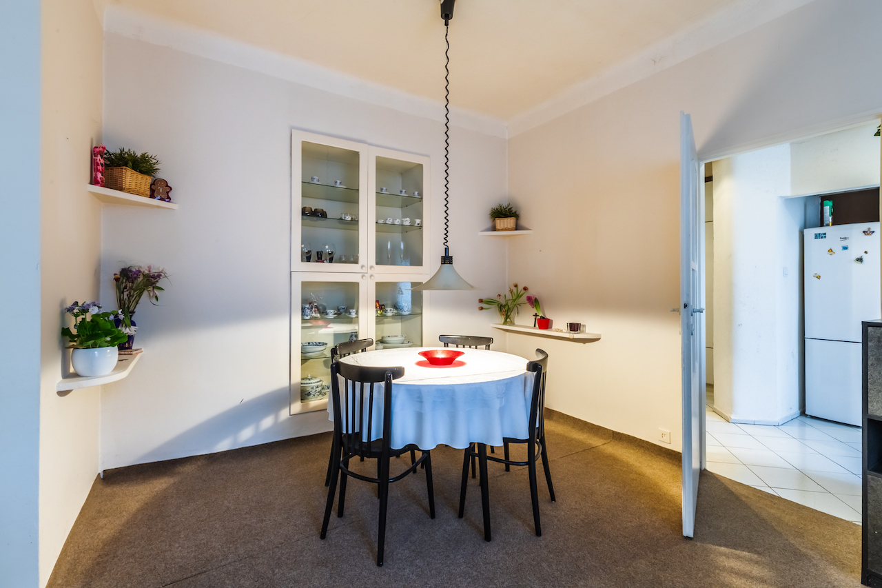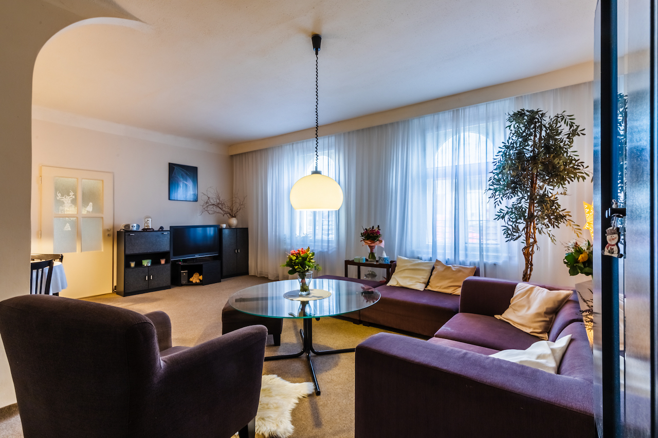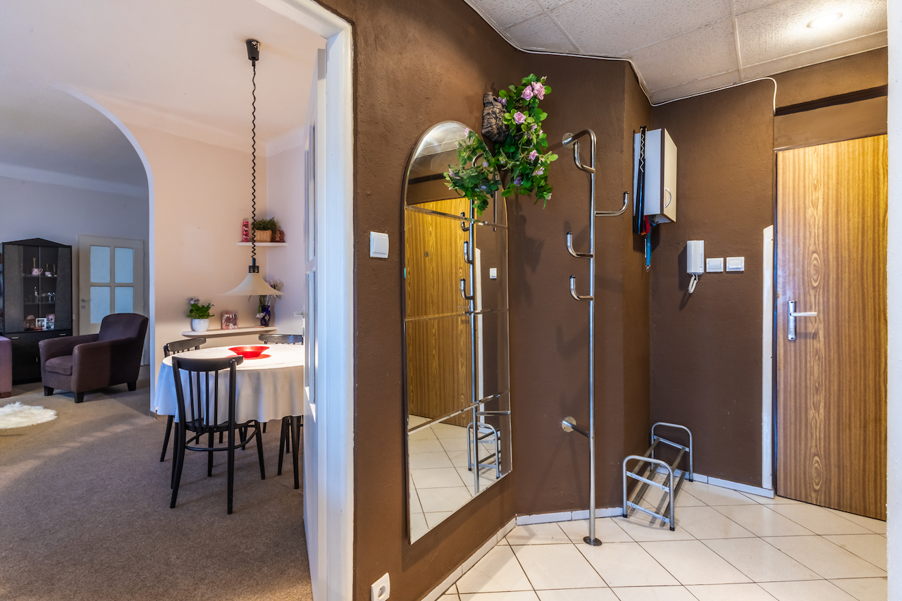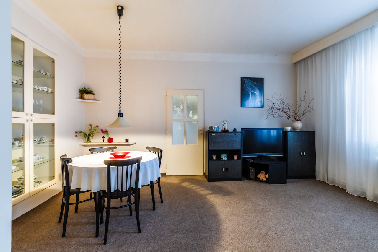 Byt se nachází v přízemí činžovního domu v ulici Družstevní, s okny do ulice i vnitrobloku. Historicky vzniknul sloučením dvou menších bytů a nyní se jedná o dispozici 3+1 s podlahovou plochou 86,7m2. Byt je v původním, ale velmi udržovaném stavu, nicméně si určitě zaslouží rekonstrukci a předělání dle aktuálních trendů. Díky dispozici a velikosti místností se nabízí několik variant, jak prostor upravit. Na současný stav popř. možnost budoucího můžete nahlédnout v pláncích či vizualizacích. V tuto chvíli je ze zádveří a chodby vstup do kuchyně, velkého obývacího pokoje s jídelním koutem, na který pak navazují další dvě ložnice, koupelna s vanou a toaleta.