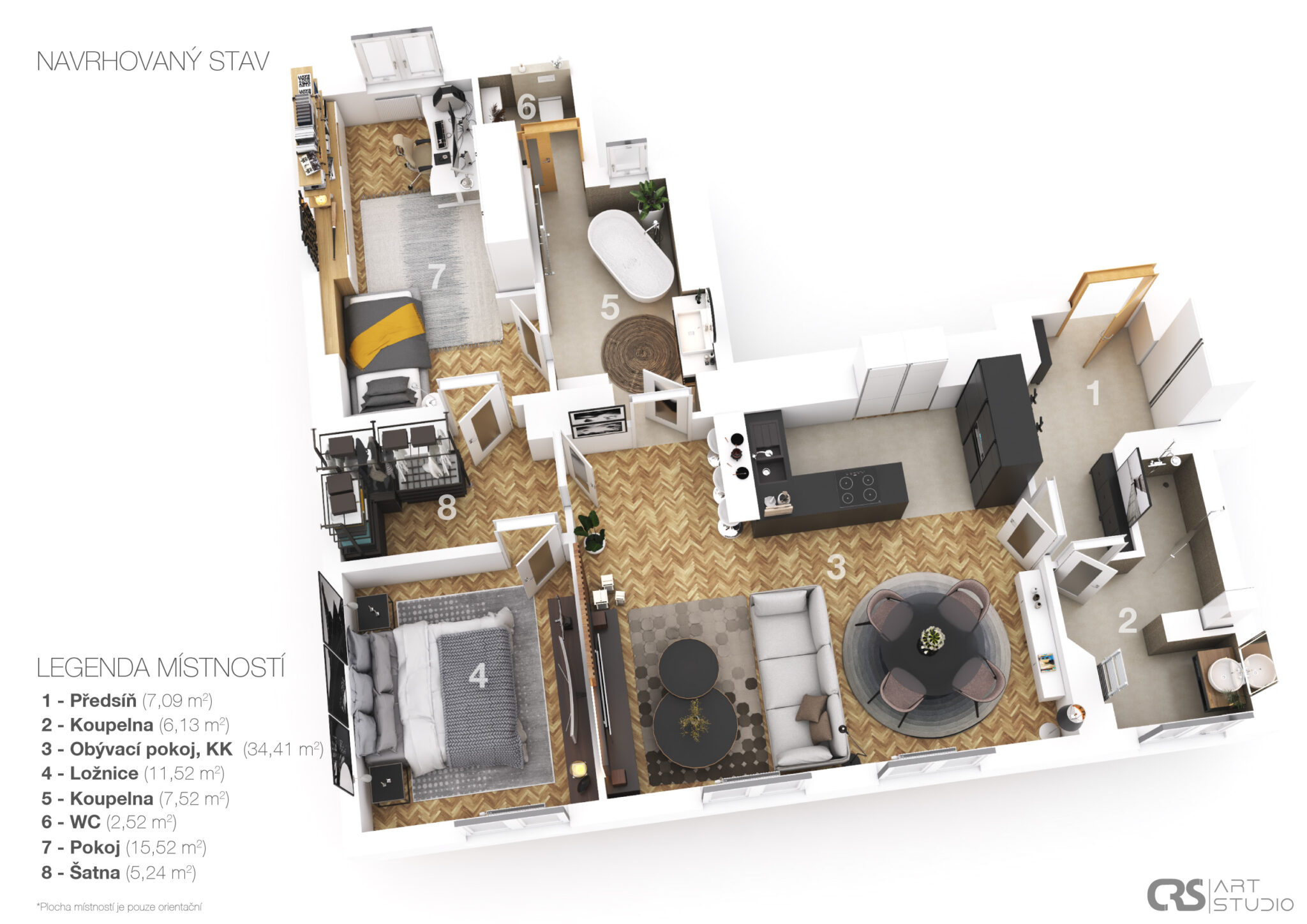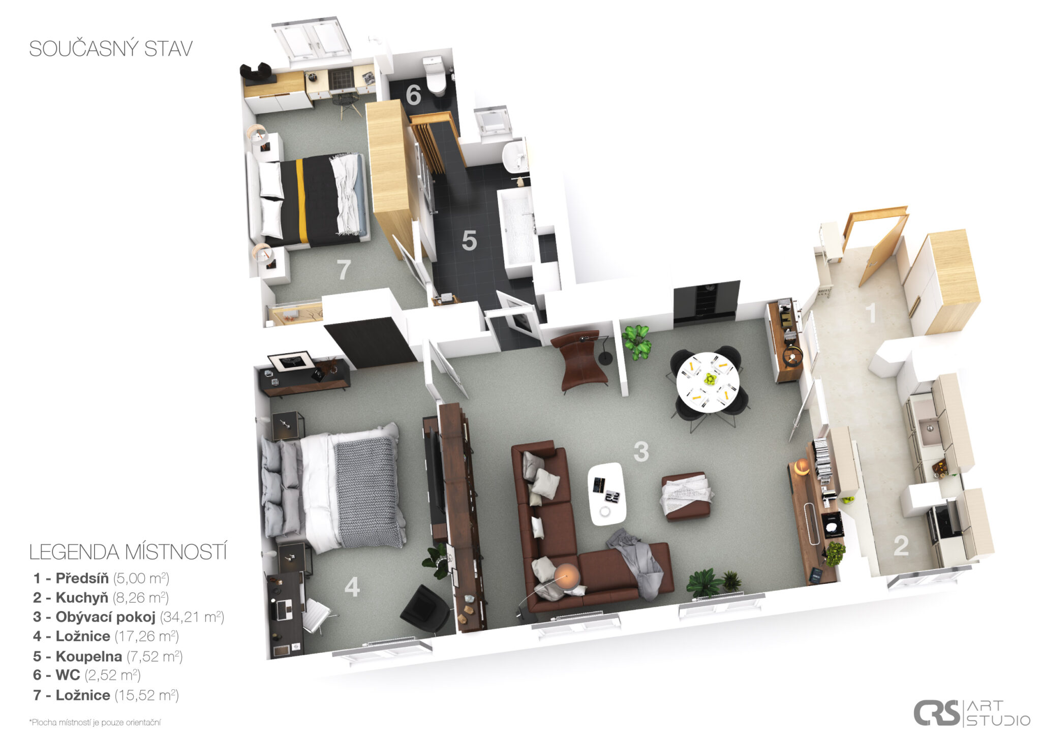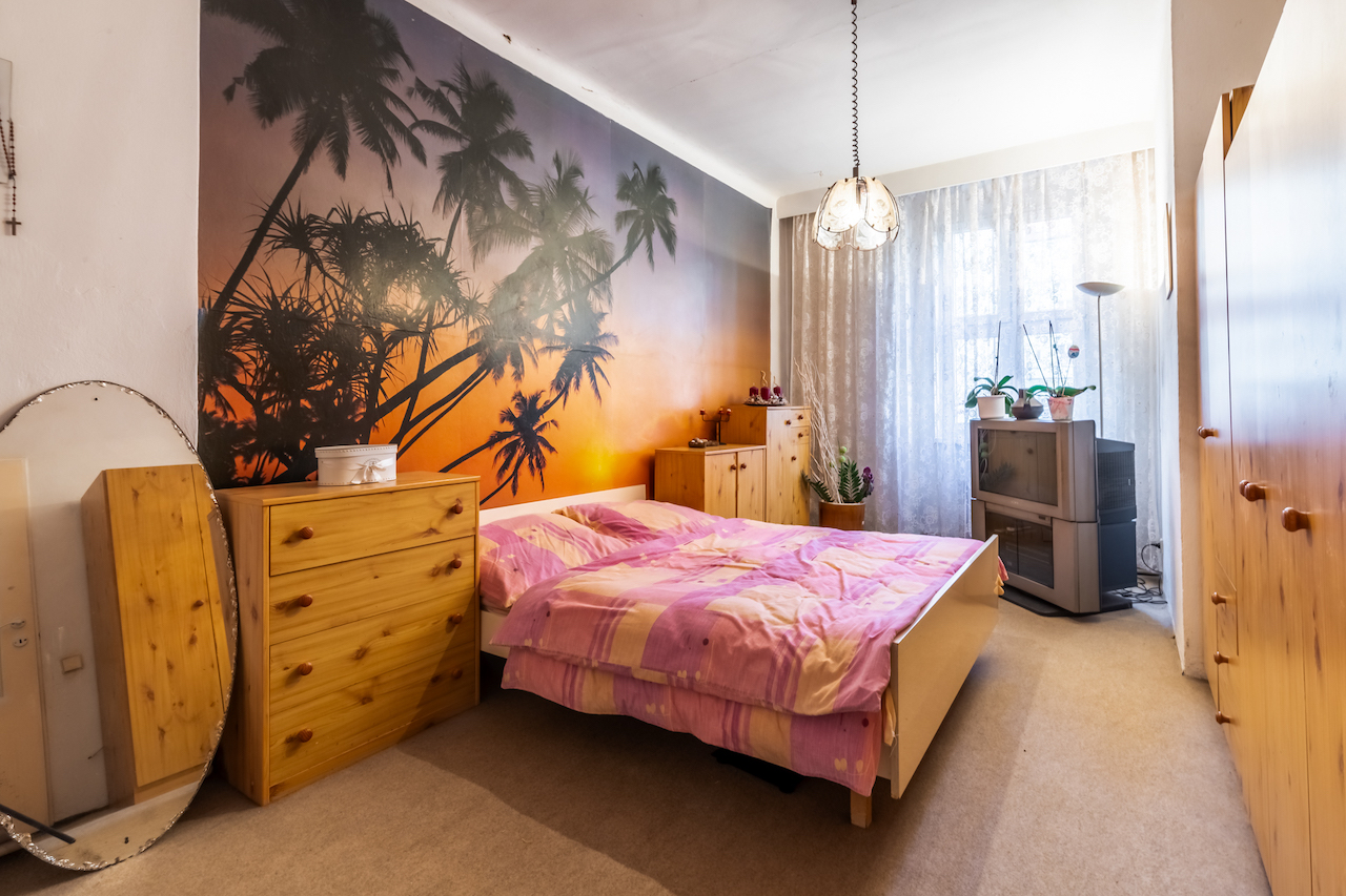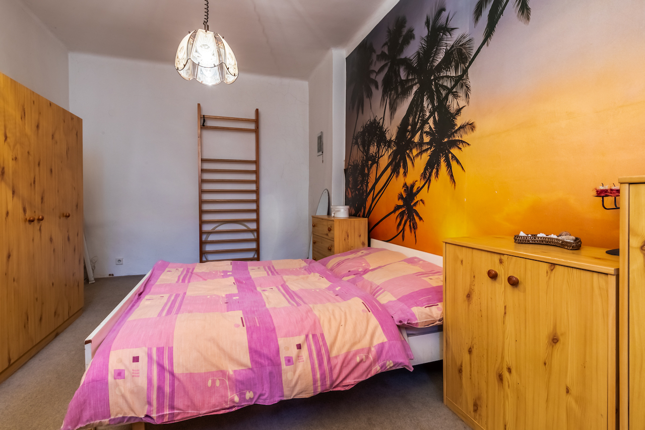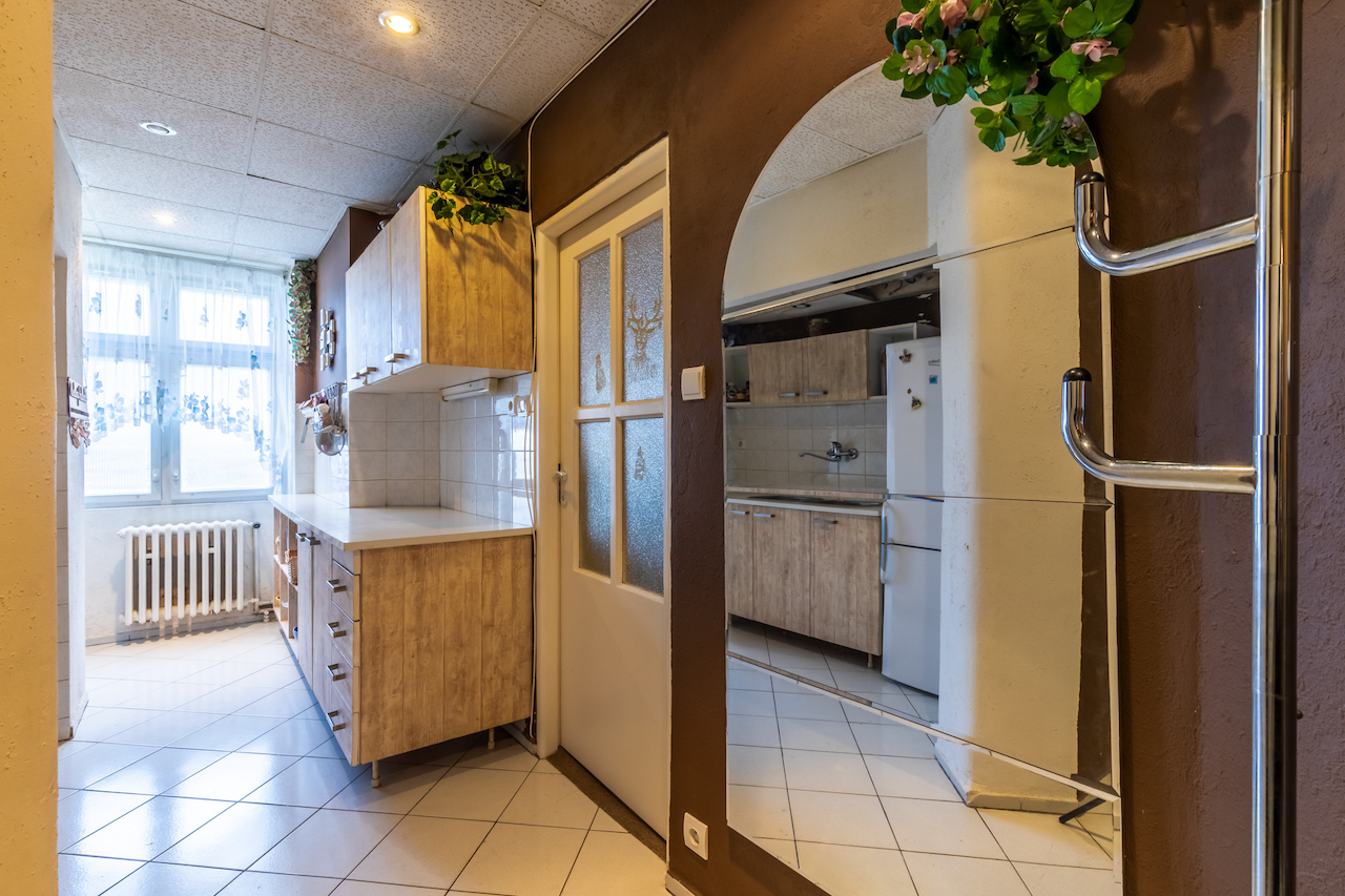 Byt se nachází v přízemí činžovního domu v ulici Družstevní, s okny do ulice i vnitrobloku. Historicky vzniknul sloučením dvou menších bytů a nyní se jedná o dispozici 3+1 s podlahovou plochou 86,7m2. Byt je v původním, ale velmi udržovaném stavu, nicméně si určitě zaslouží rekonstrukci a předělání dle aktuálních trendů. Díky dispozici a velikosti místností se nabízí několik variant, jak prostor upravit. Na současný stav popř. možnost budoucího můžete nahlédnout v pláncích či vizualizacích. V tuto chvíli je ze zádveří a chodby vstup do kuchyně, velkého obývacího pokoje s jídelním koutem, na který pak navazují další dvě ložnice, koupelna s vanou a toaleta.