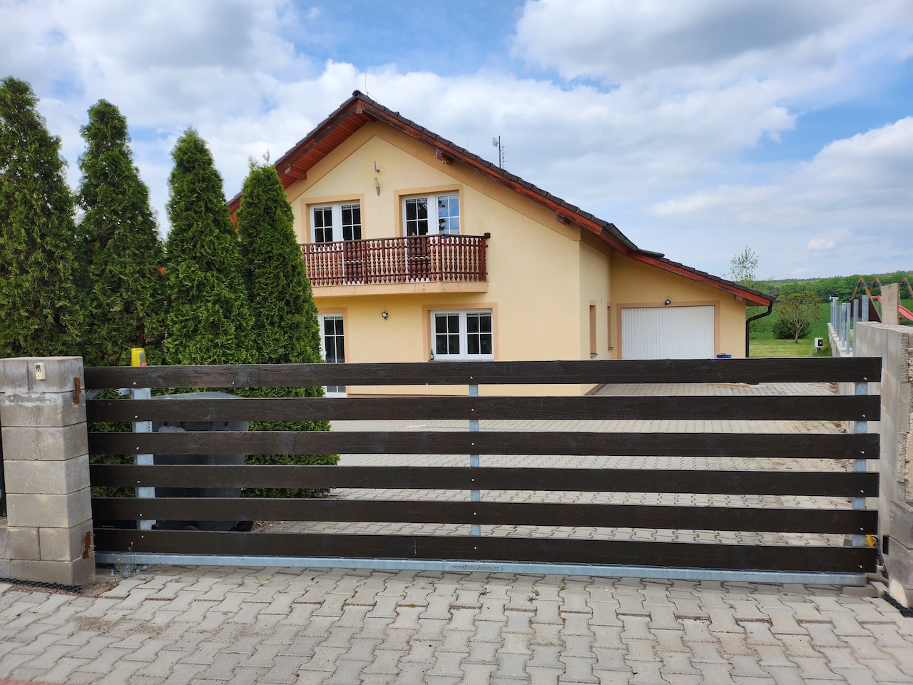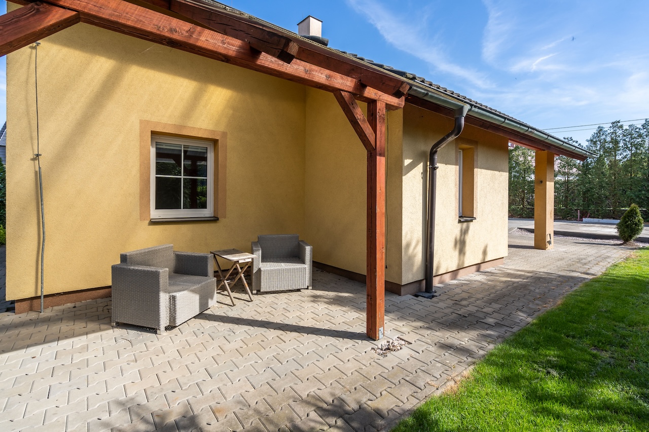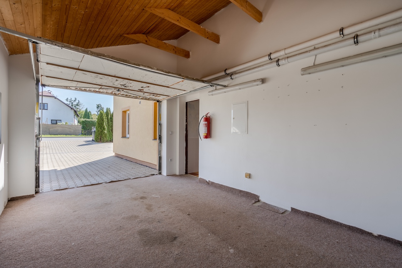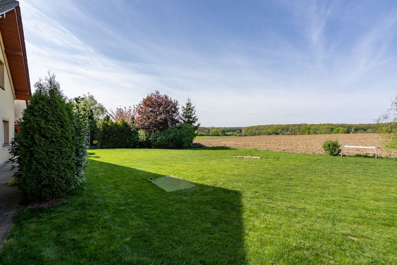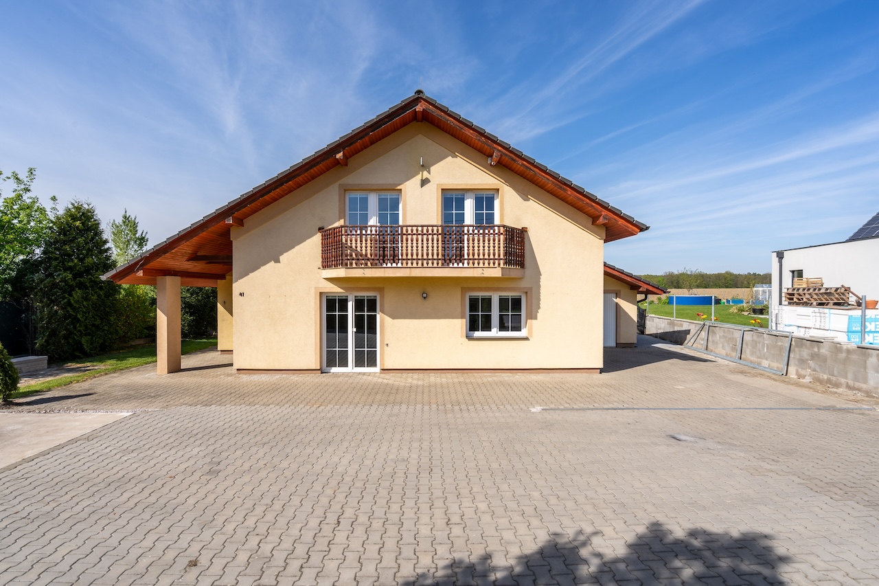 Vedle dvora opatřeném zámkovou dlažbou je příprava na dvougaráž. Celkem tak u domu může pohodlně parkovat až 5 aut. Za domem se nachází zahrada s výhledem do přírody. K pozemku za zahradou přiléhá pole, na nějž navazuje les.