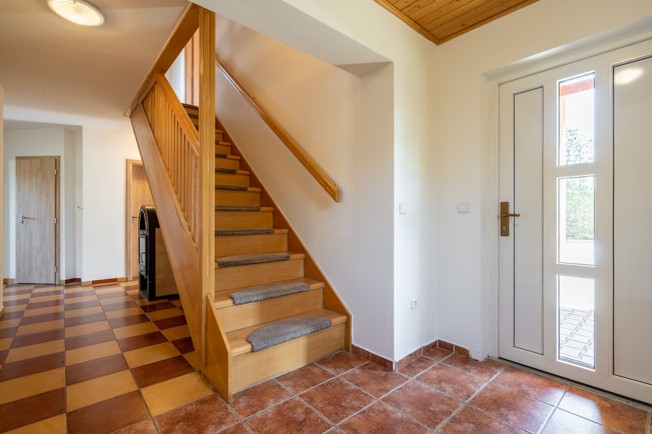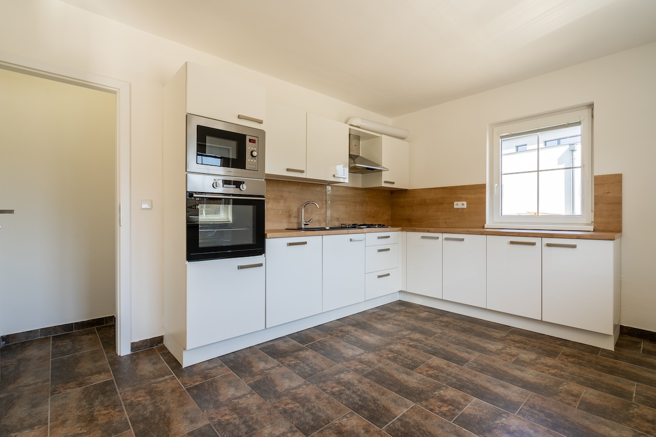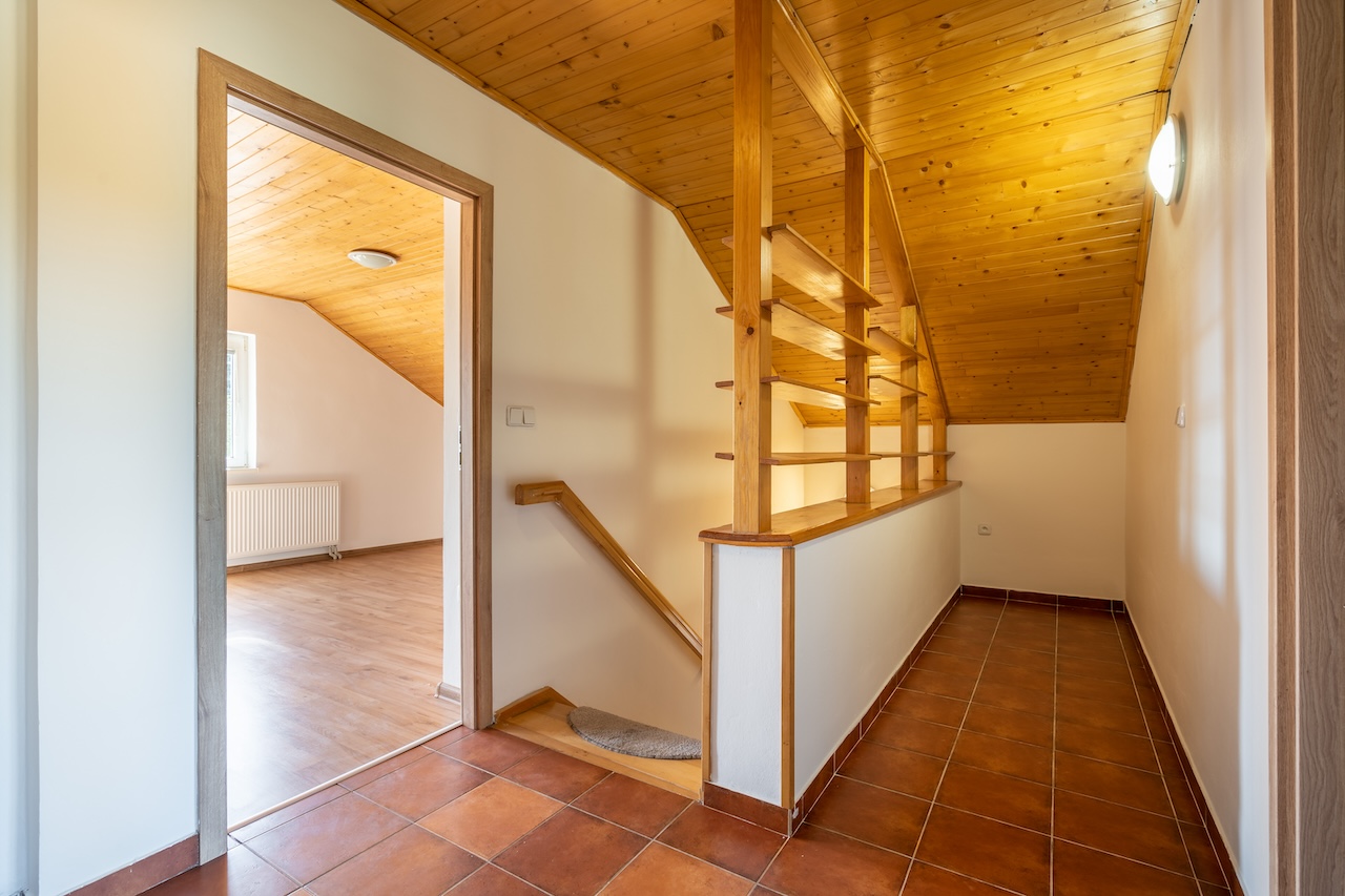 V přízemí domu se nachází obývací pokoj, zařízená kuchyně, 2 pokoje (jeden se šatníkem), chodba, koupelna, WC, technická místnost a dále pak k domu přiléhající garáž s přístupem do domu. V prvním patře jsou 2 pokoje, obývací pokoj, kuchyně, chodba a koupelna s WC. Vytápění je zabezpečeno plynovým kotlem, v případě potřeby lze využít i krbová kamna na pevná paliva. Koupelna a WC v přízemí disponují elektrickým podlahovým vytápěním. Dům je energeticky úsporný a celkové měsíční náklady na dodávky vody, elektřiny, vytápění plynem, kanalizaci a odvoz odpadu se pohybují do 5000 kč.