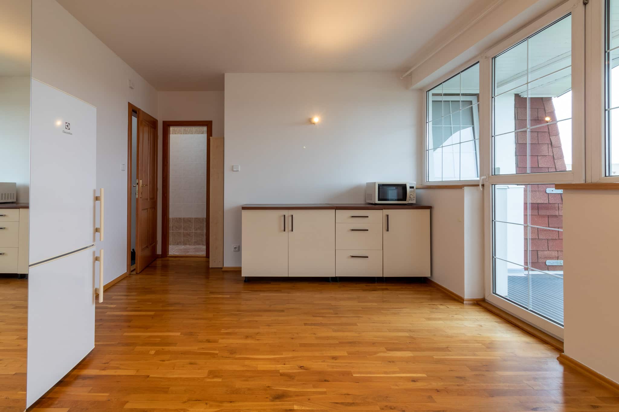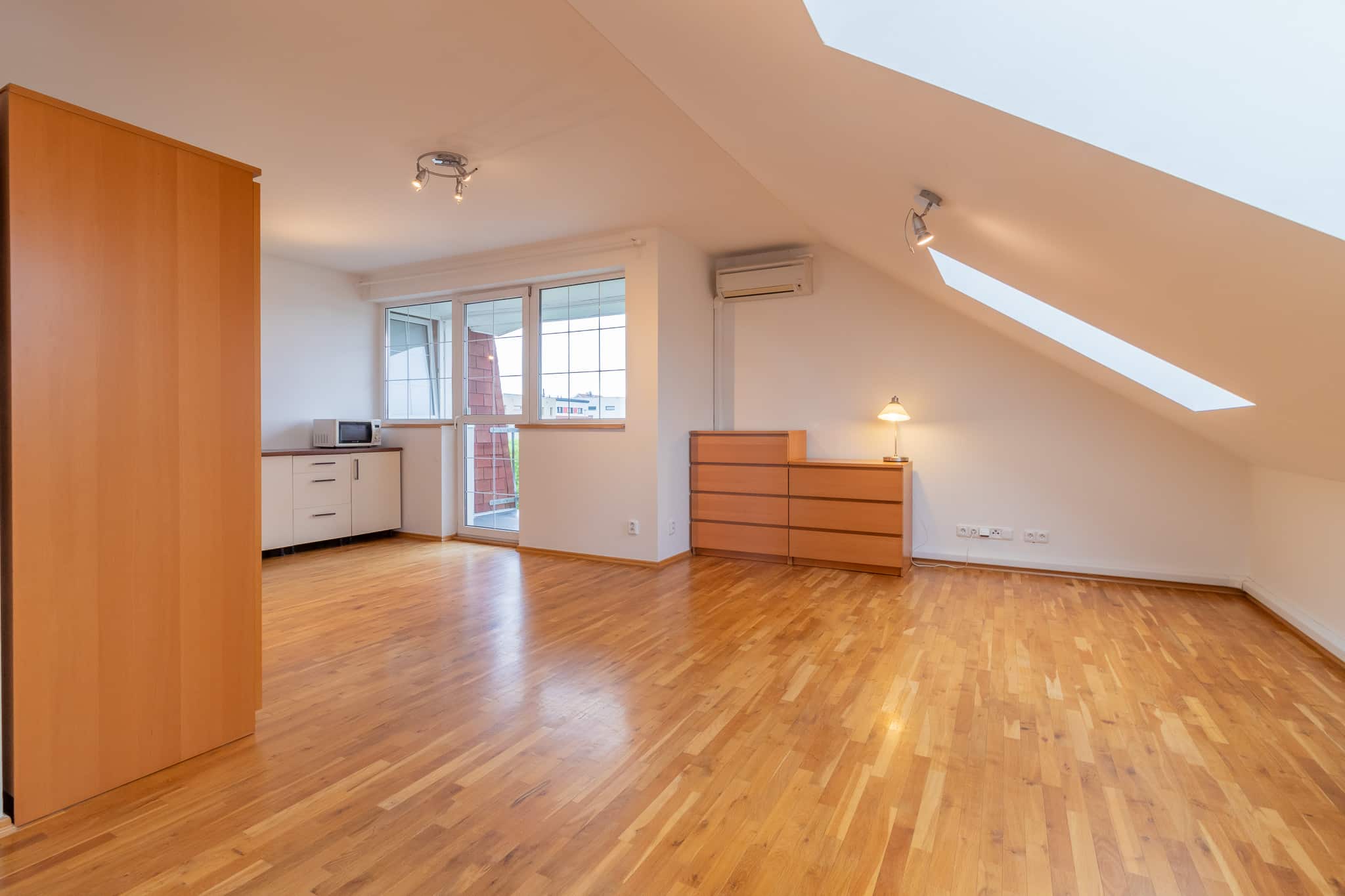 Exklusivně nabízíme pronájem atypického bytu 1+kk, 43m2 v obci Zbuzany, odkud je skvělá dostupnost do Prahy (16min na Anděl). Byt se nachází v druhém patře (podkroví) bytového domu a skládá se z obytné místnosti s jednoduchou kuchyňskou linkou (bez dřezu), jídelním koutem a obytným prostorem s ložnicí. Byt je vhodný pro jednu, maximálně dvě osoby ke klidnému bydlení s dostatkem prostoru a skvělou dostupností do Prahy. Kuchyň je vybavena lednicí s mrazákem a mikrovlnou troubou . Byt je klimatizovaný. K bytu patří také lodžie s výhledem na západ. V koupelně je rohová vana, dvě umyvadla a wc. Byt je dobrém stavu a součástí vybavení je také šatní skříň a dvě komody. Obec Zbuzany se nachází na jihozápadním okraji Prahy nedaleko Pražského okruhu, se skvělou dopravní dostupností do centra (15 minut vlakem na Nádraží Smíchov, vlaková zastávka je jen 4 minuty pěšky od bytu). Parkování je možné před domem. Výše měsíčního nájmu je 9.295,-Kč + 3.705,-Kč fixní poplatky (vč. internetu – je třeba mít vlastní router). Majitel požaduje vratnou kauci ve výši 13.000,-Kč + provize realitní kanceláře 13.000,- vč. DPH. Doporučuji prohlídku.