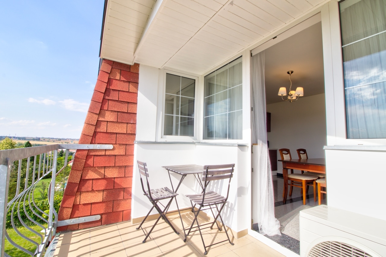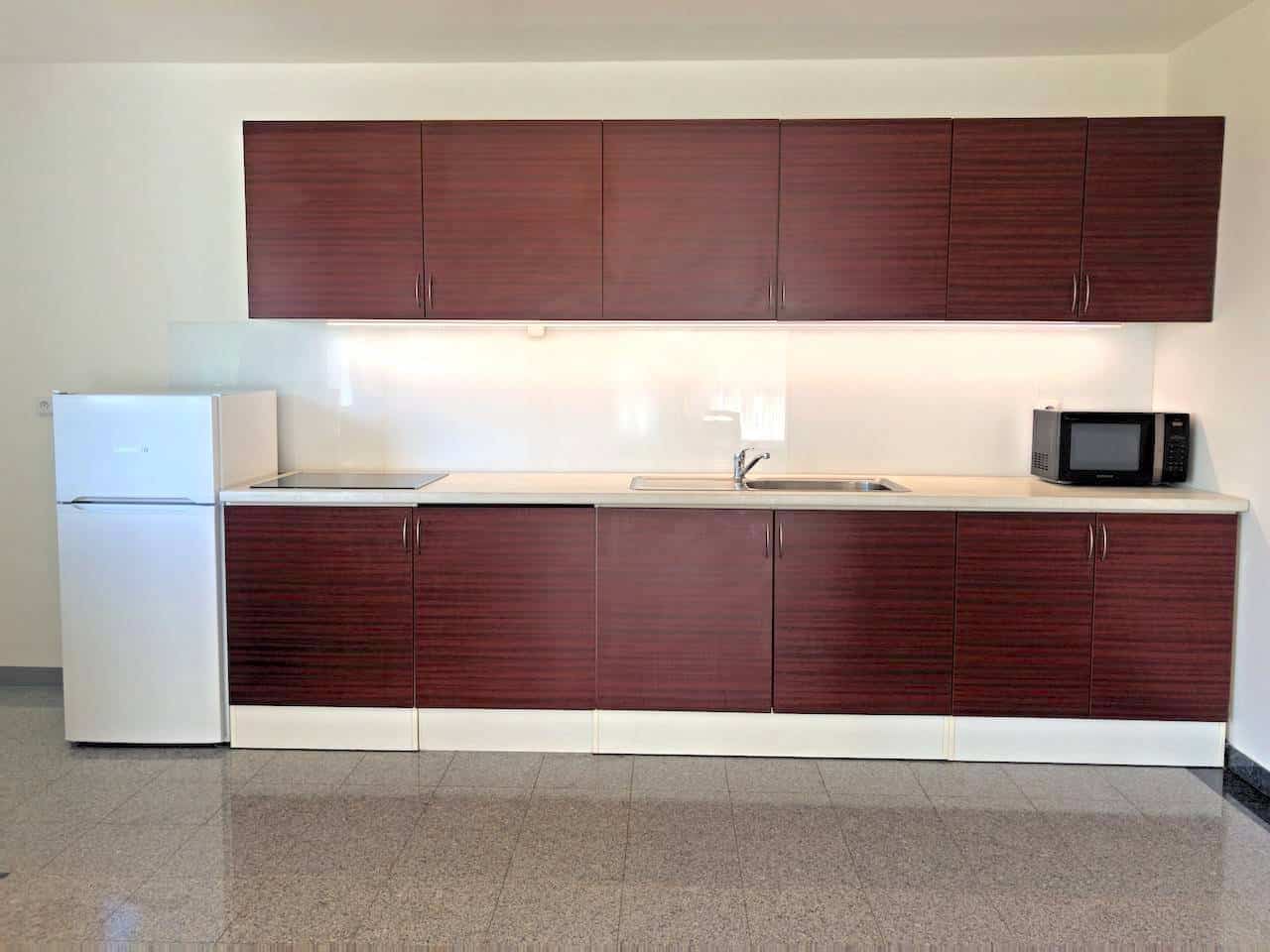 Byt se nachází v druhém patře bytového domu a skládá se ze vstupní haly, koupelny, kuchyně, velkého obývacího pokoje a balkonu. Díky francouzským oknům je byt skutečně velmi světlý a ideálně vhodný pro jednu až dvě osoby ke klidnému bydlení s dostatkem prostoru. Kuchyň je vybavena lednicí, mikrovlnou troubou a varnou sklokeramickou deskou. Součástí je také jídelní stůl s židlemi, klimatizací a krbem, který však slouží pouze k dekorativním účelům. K bytu patří také balkon s výhledem na západ. V koupelně je vana, umyvadlo, wc a přípojky na pračku. Byt i dům jsou v perfektním stavu a připraveny na nového nájemníka.